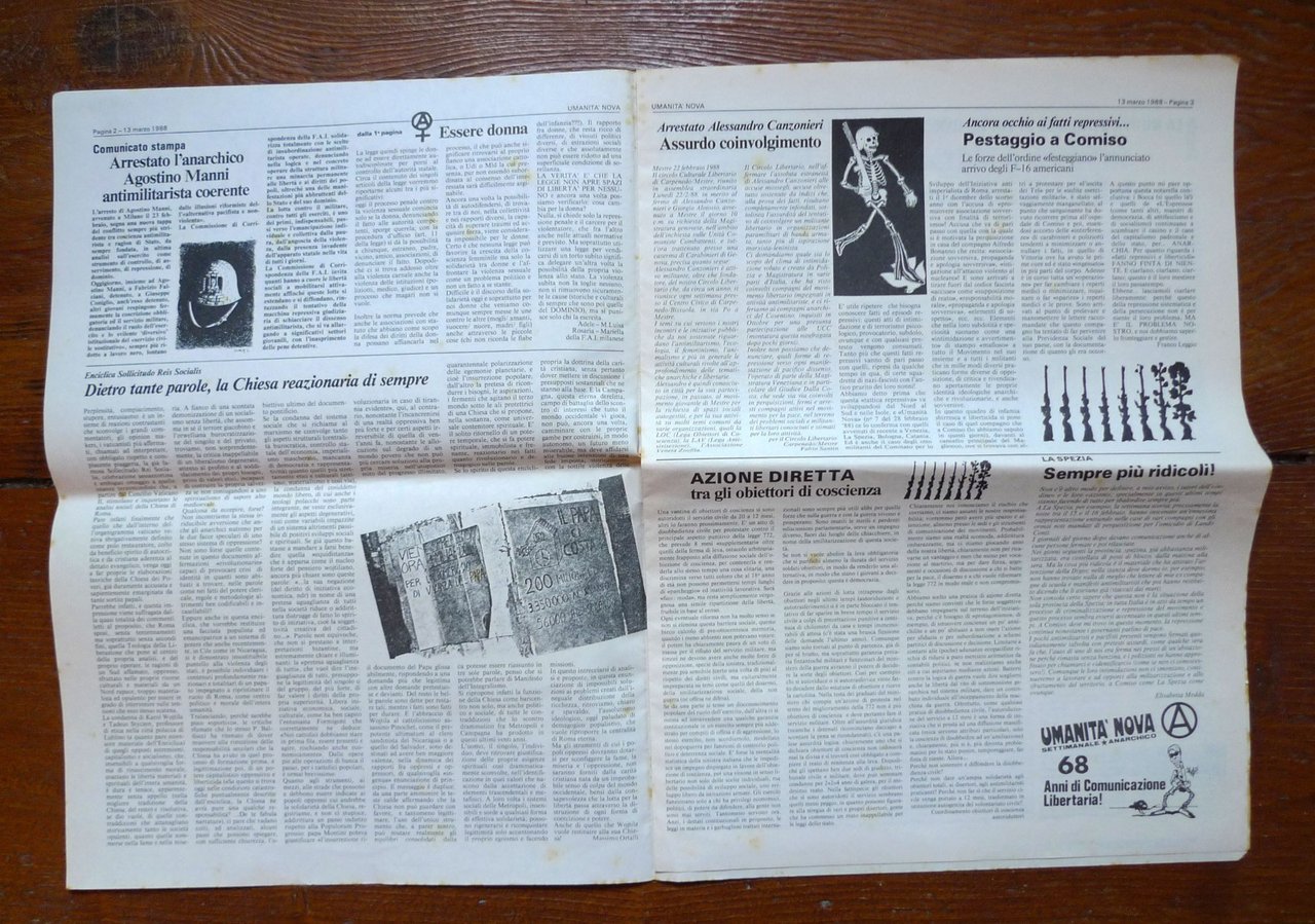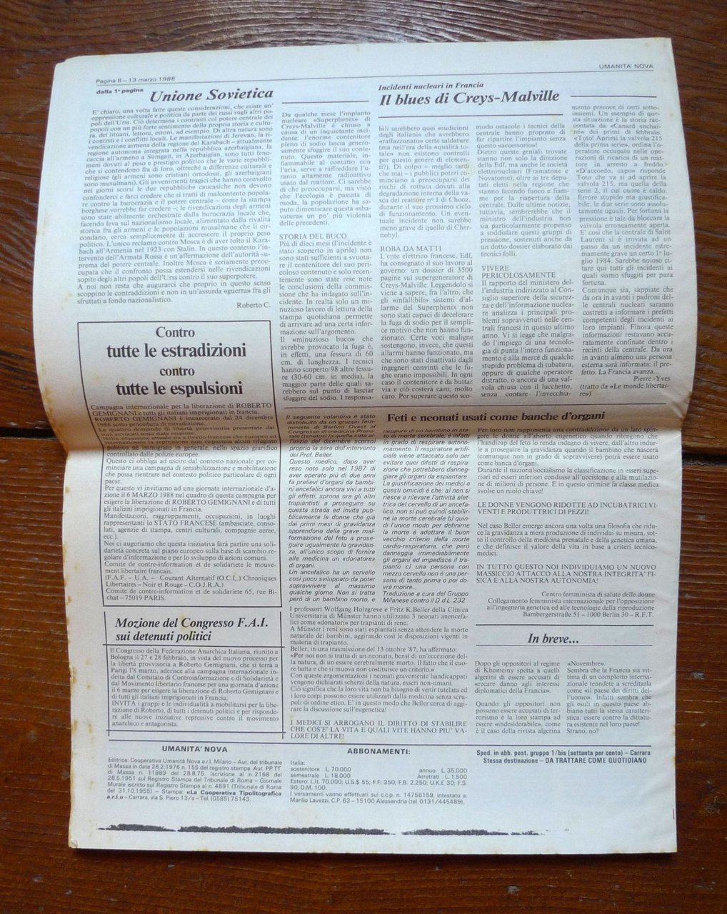 UMANITÀ NOVA Anno 68 n.8 13 marzo 1988Settimanale anarchico.Direttore responsabile: Sergio Costa.40x30 cm., pp.8,illustrazioni in bianco e nero,peso: g.300cod.100101CONDIZIONI DEL PERIODICO: buone,piega centrale,pagine leggermente ingiallite,fioriture
