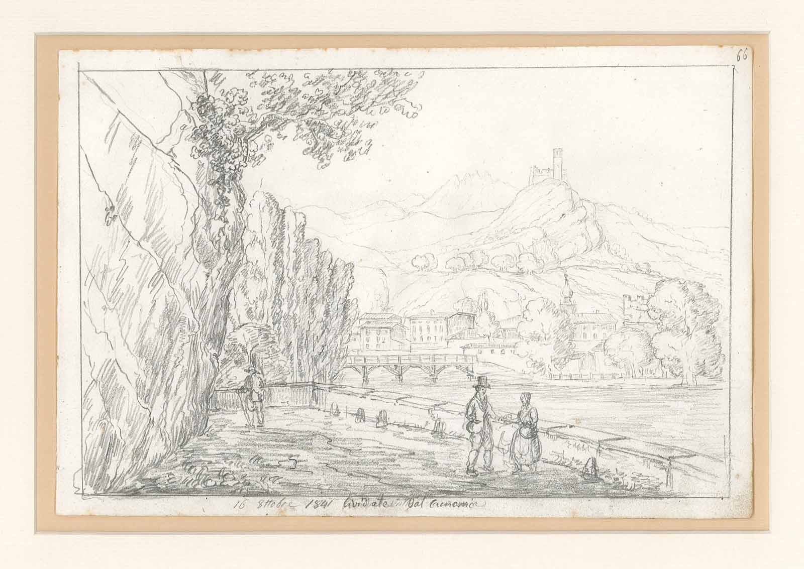 Disegno n° 66 raffigurante una veduta del paese di Cividate, attribuito al famoso pittore bergamasco Pietro Ronzoni (Serina 1781 - Bergamo 1862). Opera pubblicata in "La Bergamasca / e dintorni / di / Pietro Ronzoni" di Lanfranco Ravelli critico d'arte bergamasco. Pubblicazione di 60 disegni edita sia dalla Banca di Bergamo che dalla Galleria Previtali di Bergamo. Montato in elegante cornice di ciliegio chiaro della misura di cm. 34x44. Al disegno è allegato uno dei volumi prima citati su cui è stato pubblicato