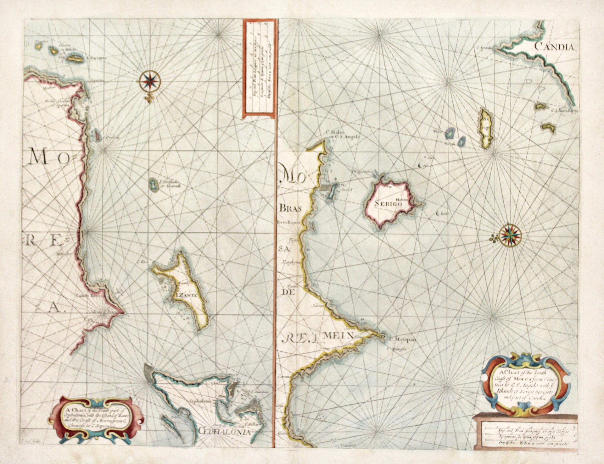 Incisione in rame, dipinta a mano, mm 402x523. Coppia di carte nautiche su un foglio; a sinistra Zante, Morea e il settentrione di Cefalonia; a destra Morea, Cerigo e parte di Creta. Da Thornton “The English Pilot Part III….the Whole Mediterranean Sea” pubblicato da Mount & Page. Buone condizioni generali eccetto una mancanza restaurata al margine inferiore che non intacca l'inciso. Sabin 95631; and Phillips 2833, 3455.