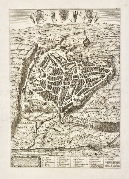 Acquaforte e bulino, mm 274x394, impressa su carta vergata. Si tratta della prima pianta prospettica della città con il titolo in alto su nastro accompagnato dagli stemmi del cardinale Aurelio Luciani, del papa Innocenzo XI e della città. In basso entro un cartiglio vi è la dedica ad Aurelio Luciani ed appena sopra l'indirizzo editoriale "Gio. Giacomo Rossi le stampa in Roma alla Pace l'anno 1686". In basso a destra appare una legenda con 30 rimandi. La stampa venne pubblicata in 5 stati differenti: in origine da Paolo Graziani nel 1582 di cui un solo esemplare è conosciuto; successivamente con l'indirizzo di Pietro de Nobili aggiunto in qualità di socio del Graziani, databile entro il 1585; poi con i loro indirizzi editoriali abrasi ma leggibili, post 1586 anno della morte del De Nobili; poi con l'indirizzo di De Rossi, che la acquistò da Arbotti, senza data (ma 1650 c.); infine con il medesimo indirizzo ma datata come nel nostro esemplare che riporta anche una dedica nuova, stemmi nuovi e variazioni nella legenda. Nessun esemplare censito dalla bibliografia consultata. Ottimo esemplare con ampi margini. Uno strappo restaurato a sinistra.<BR>Bifolco-Ronca, Cartografia e topografia italiana del XVI secolo, 1072.<BR>