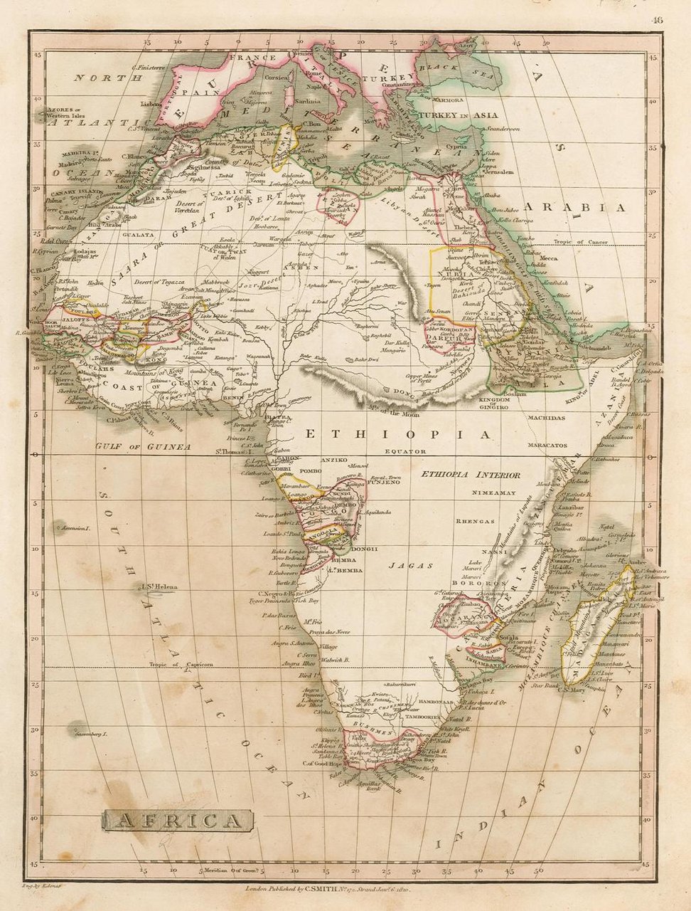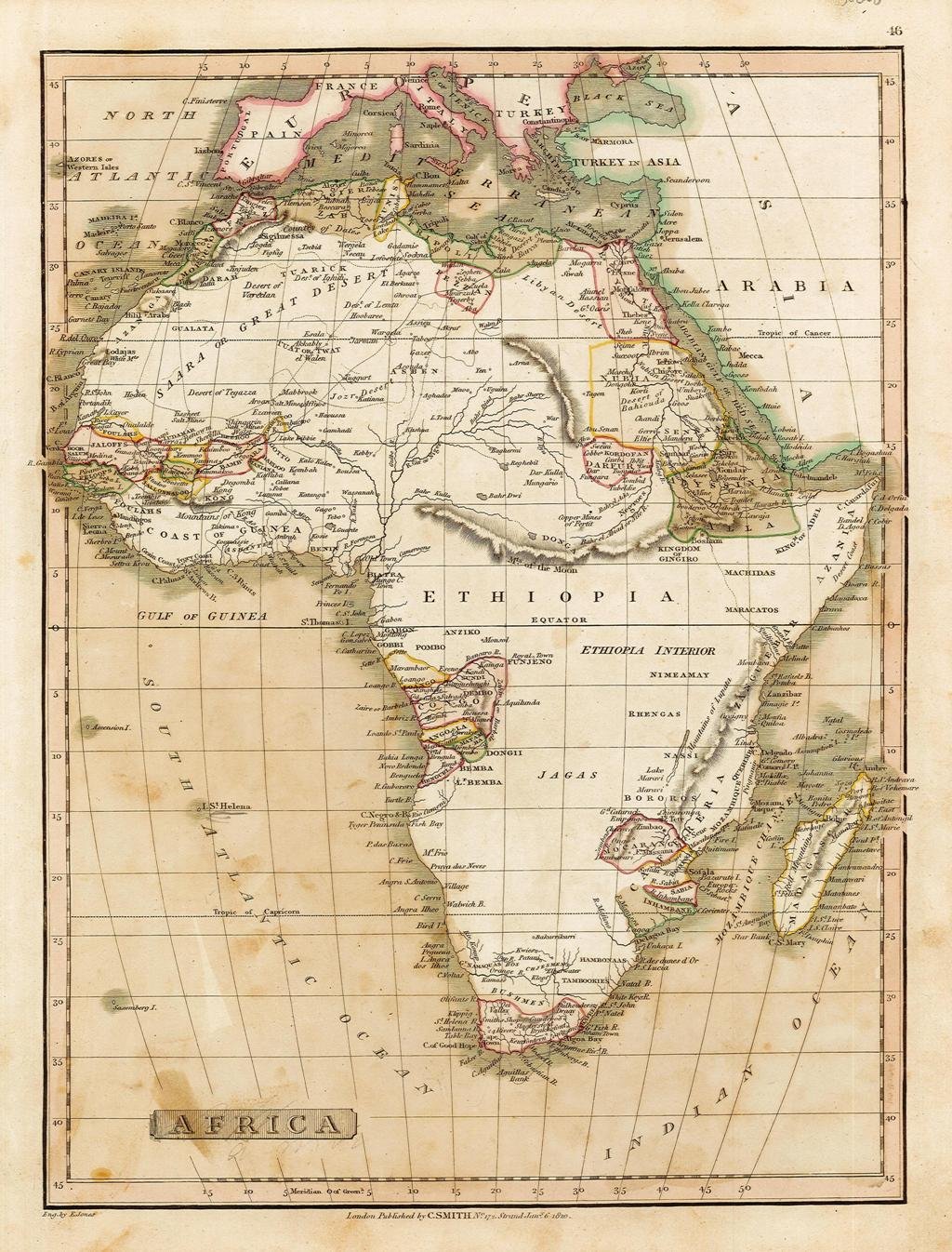 Carta geografica, in coloritura coeva, riguardante il continente africano. Inserita nell'opera "Smith's New General Atlas Containing Distinct Maps Of all the Principal Empires, Kingdoms, & States Throughout the World arranged according to the General Treaty signed in Congress at Vienna June 1815 - London, Printed for C. Smith, Mapseller extraordinary, To His Majesty. N° 172 Strand with additions 1822 to 1824". Edizione non menzionata dal Phillips