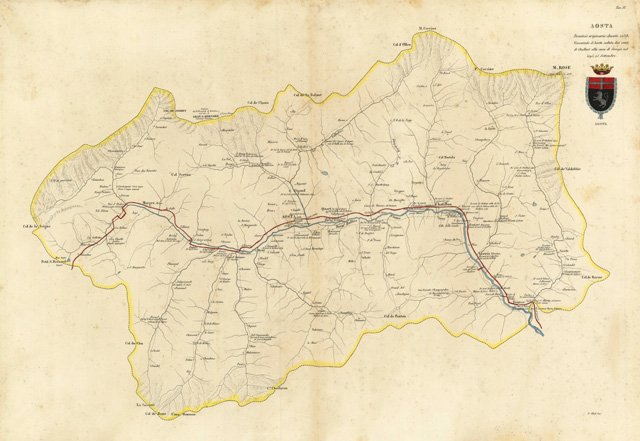 Carta geografica della Val d'Aosta con evidenziate le località di: Courmayeur, Morgez, Aosta, Gignod, Quart, Chatillon Verres Donnaz e Pont San Martin. Bella è la coloritura coeva con stemma di Aosta miniatoi. Carta leggermente brunita, piega centrale editoriale cd2606