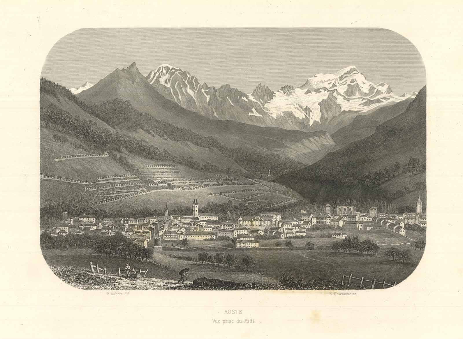 Stampa, antica ed originale, con veduta generale della cittadia di Aosta a cui fanno da sfondo le Alpi. Tratta dall'opera "La Vallée d'Aoste de Edouard Aubert" edita a Parigi da Amyot. Autore: Aubert E. del. - E. Chavanne sc. Luogo: Valle d'Aosta - Aosta. Anno: 1860. Tecnica: incisione in acciaio. Dimensioni: 156x226 mm