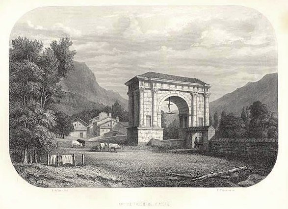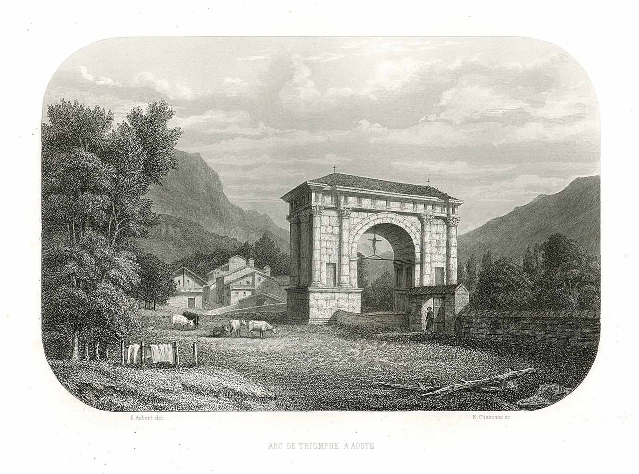 Stampa, antica ed originale, con veduta dell'Arco di Aosta a cui fanno da sfondo le Alpi. Tratta dall'opera "La Vallée d'Aoste de Edouard Aubert" edita a Parigi da Amyot. Autore: Aubert E. del. - E. Chavanne sc. Luogo: Valle d'Aosta - Aosta. Anno: 1860. Tecnica: incisione in acciaio. Dimensioni: 145x216 mm