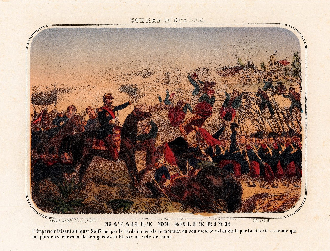 Veduta della battaglia di Solferino in coloritura coeva facente parte della rara serie "Guerre d'Italie". In basso sotto al titolo sintetica descrizione in francesce della battaglia su due righe.