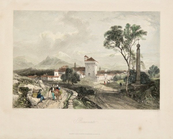 Incisione in acciaio, dipinta a mano, mm 155x228, su disegno di J.D. Harding, raffigurante una bella veduta della città fuori dalle mura. Tratta dall'opera "Italy / Classical, Historical and Picturesque" di Camillo Mapei. Buon esemplare con qualche macchia di foxing marginale. <BR><BR>