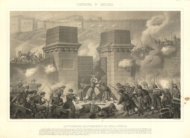 Raffigurazione dell'assalto a porta Santa Margherita da parte dell'avanguardia del V corpo avvenuto a Perugia il 14 settebre del 1860. Al centro della raffigurazione il Sergente Ruggia insieme agli zappatori Isoardo e Cabiati grazie al cui sforzo viene spalancata la porta della città
