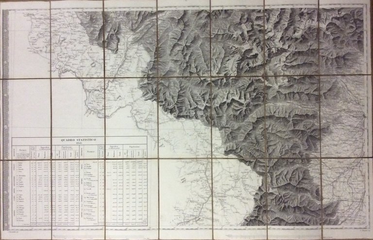 Carta topografica incisa in rame e montata su tela (cm. 53,5x82,5), suddivisa in 21 riquadri. Di questa carta composta da 6 fogli in scala 1:250.000, offriamo il Foglio 3, che racchiude Susa, Chambéry, Monviso. In basso a sinistra una tabella con ripartizione in divisioni, mandamenti e comuni, dati di popolazione e superficie (Quadro statistico/ 1846); in basso a sinistra V. Brambilla dis., a destra: G. Biasioli inc.. Carta nota anche come "Carta Brambilla", dal nome del coordinatore del gruppo di topografi dello Stato Maggiore che eseguirono i rilievi per la realizzazione di una carta ufficiale dello Stato Sardo, tra 1816 e 1830. L'intenso lavoro di misurazione e rilevazione del territorio piemontese, compiuto tra 1816 e 1830 dal Reale Corpo di Stato Maggiore Generale, appena istituito, ebbe una prima stesura, manoscritta e non pubblicata, in 113 fogli (scala 1:50.000).Una riduzione in scala 1:250.000, in 6 fogli, fu stampata nel 1841 con il titolo "Carta degli Stati di sua Maestà Sarda in Terraferma", nota come "Carta Brambilla", della quale, nel 1846, venne pubblicata un'ulteriore riduzione in un unico foglio (1:500.000). La carta ebbe, probabilmente, successive edizioni. Revisioni e rielaborazioni della carta, portarono infine alla pubblicazione, tra 1852 e 1867, della nuova versione della "Carta topografica degli Stati in Terraferma di S.M. il Re di Sardegna" in 91 fogli (scala 1:50.000), che subì un'ulteriore revisione tra 1871 e 1874. Tale carta costituì la base delle successive carte dellIGM (Istituto Geografico Militare) per la rappresentazione dello Stato unitario.Cfr. F. Barrera, Il Piemonte nella cartografia degli Stati Sardi tra Restaurazione e Unità d'Italia, n. 44-49 (ed. 1846) - L. e G. Aliprandi, Le grandi Alpi ( 2005), v. 1, pp. 116-117.Ben conservata..