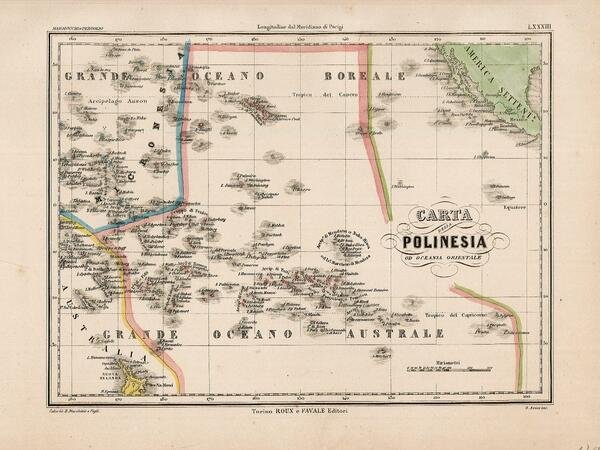 Carta geografica in litografia, antica ed originale del 1878, di mm 240x340 (il foglio) con coloritura confinale coeva. Stampata dalla calco-litografia di B. Marchisio & Figli ed inserita nell'opera a cura del Cavaliere Celestino Peroglio raffigurante la Polinesia