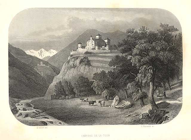 Stampa, antica ed originale, con graziosa veduta del paese animata da personaggi. Tratta dall'opera "La Vallée d'Aoste de Edouard Aubert" edita a Parigi da Amyot. Autore: Aubert E. del. - E. Chavanne sc. Luogo: Valle d'Aosta- La Tour. Anno: 1860. Tecnica: inc. in acciaio. Dimensioni: 145x215 mm
