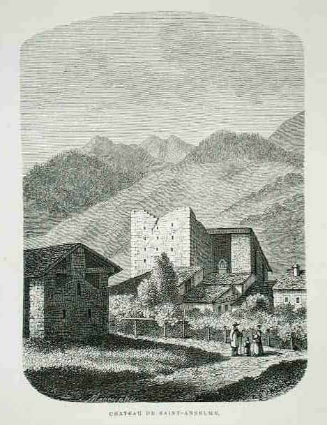 Veduta del castello di Saint-Anselme.Tratta dall'opera " La Vallée d'Aoste " stampata a Parigi da Amyot