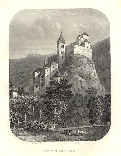Veduta del castello di Saint-Pierre in Valle d'Aosta. L'immagine testimonia l'originale struttura del castello, prima degli interventi che ne modificheranno la struttura. Ottimo stato di conservazione.