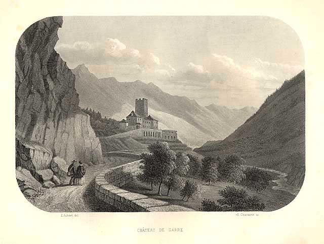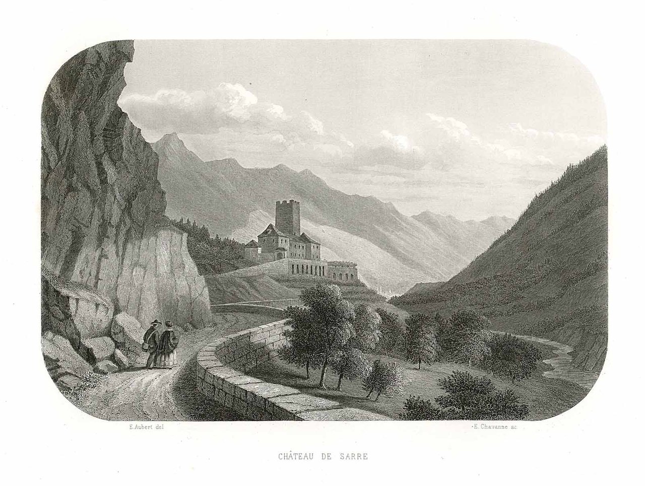 Stampa, antica ed originale, del Castello. Tratta dall'opera "La Vallée d'Aoste de Edouard Aubert" edita a Parigi da Amyot. Autore: Aubert E. del. - E. Chavanne sc. Luogo: Valle d'Aosta - Sarre. Anno: 1860. Tecnica: incisione in acciaio. Dimensioni: 145x215 mm