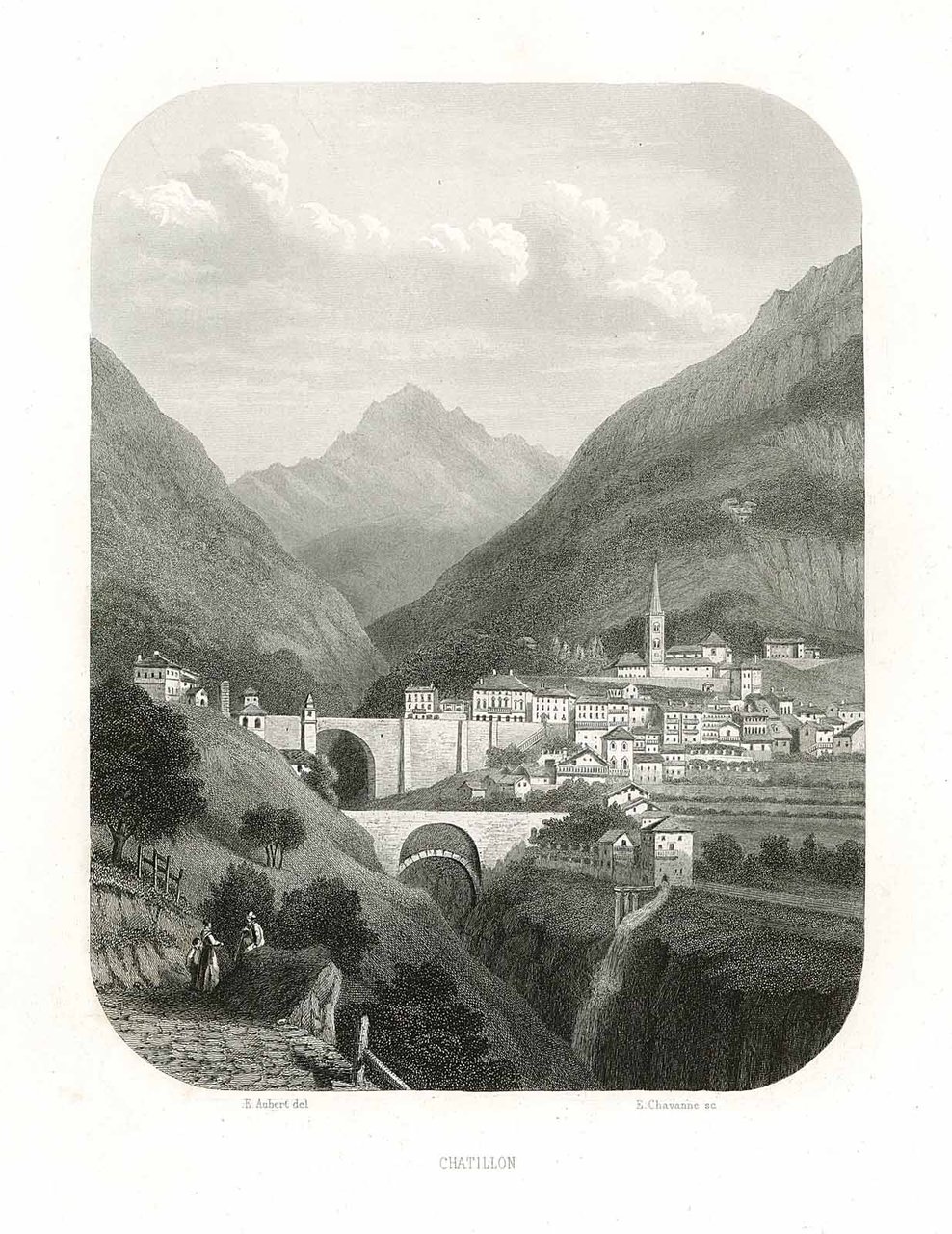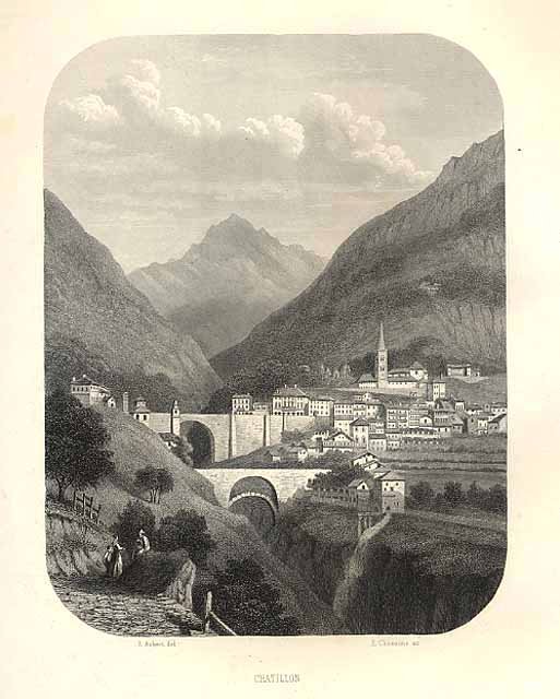 Stampa, antica ed originale, della cittadina. Tratta dall'opera "La Vallée d'Aoste de Edouard Aubert" edita a Parigi da Amyot. Autore: Aubert E. del. - E. Chavanne sc. Luogo: Valle d'Aosta - Chatillon. Anno: 1860. Tecnica: incisione in acciaio. Dimensioni: 188x144 mm
