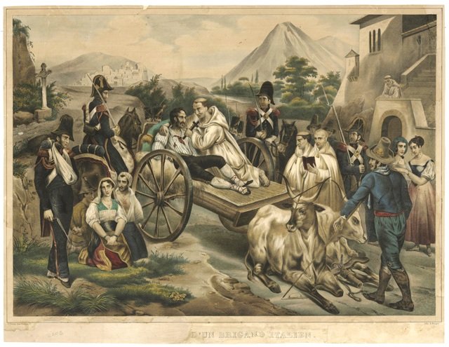 Bella veduta, colorata all'epoca, dell'arresto di un brigante. La stampa molto decorativa presenta diversi restauri da strappi, in modo particolare con mancanze nei margini.