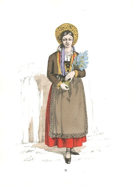 Costume caratteristico del luogo, disegnato, stampato e colorato a mano dal pittore Aldo Fornoni coadiuvato dalla pittrice Maria Angela Grassi