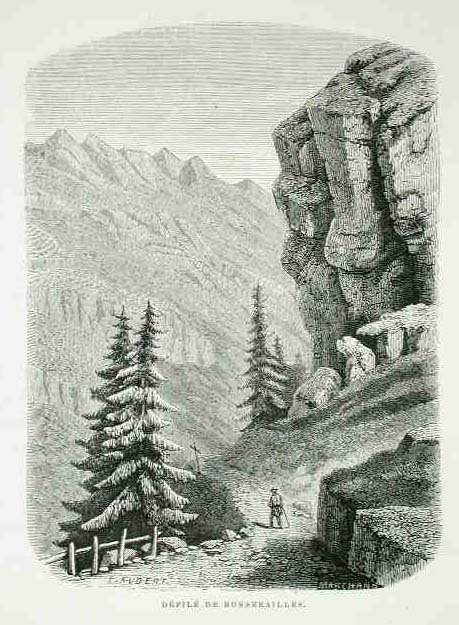 Veduta della Gola di Busserailles in Val d'Aosta.Tratta dall'opera " La Vallée d'Aoste " stampata a Parigi da Amyot