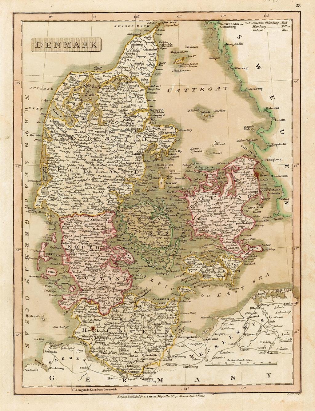 Carta geografica, in coloritura coeva, riguardante la Danimarka. Inserita nell'opera "Smith's New General Atlas Containing Distinct Maps Of all the Principal Empires, Kingdoms, & States Throughout the World arranged according to the General Treaty signed in Congress at Vienna June 1815 - London, Printed for C. Smith, Mapseller extraordinary, To His Majesty. N° 172 Strand with additions 1822 to 1824". Edizione non menzionata dal Phillips