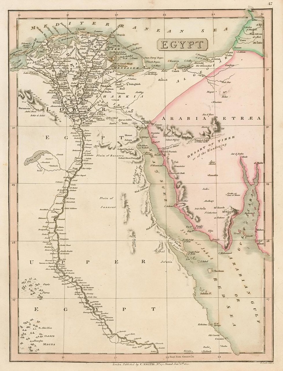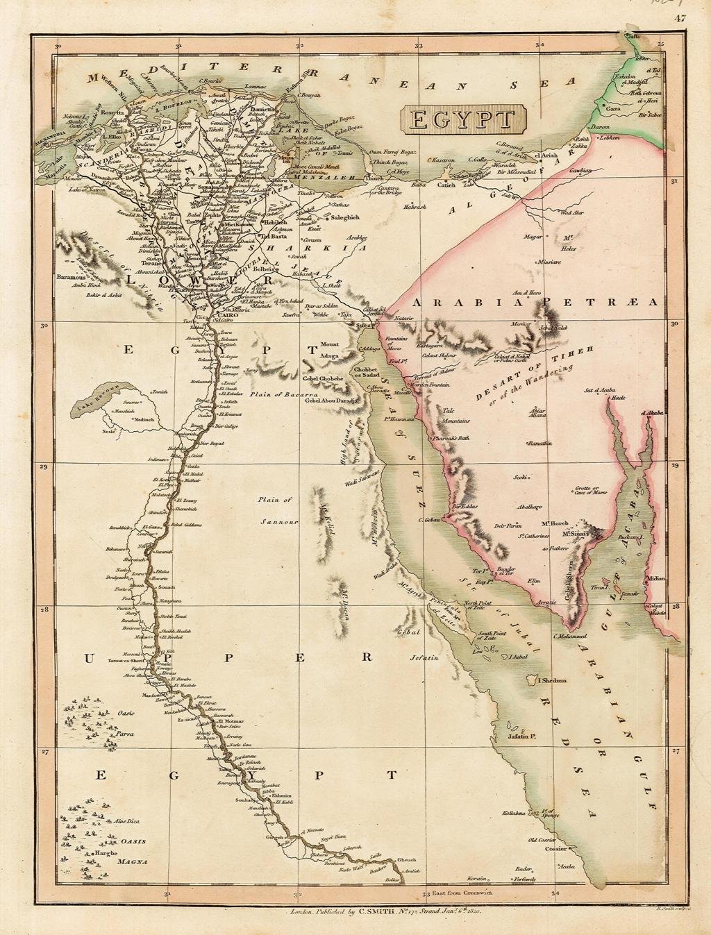 Carta geografica, in coloritura coeva, riguardante il corso del Nilo e parte del Sinai. Inserita nell'opera "Smith's New General Atlas Containing Distinct Maps Of all the Principal Empires, Kingdoms, & States Throughout the World arranged according to the General Treaty signed in Congress at Vienna June 1815 - London, Printed for C. Smith, Mapseller extraordinary, To His Majesty. N° 172 Strand with additions 1822 to 1824". Edizione non menzionata dal Phillips