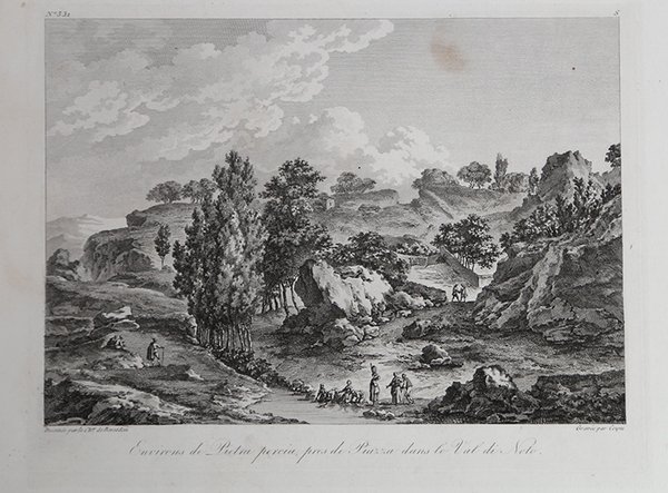 Veduta pubblicata nel ' Voyage Pittoresque ou description des Royaumes de Naples et de Sicile, opera in 5 volumi per la prima volta stampati a Parigi tra 1781 e il 1786. Richard de Saint-Non conobbe, durante il suo viaggio a Roma, i due già celebri pittori francesi Jean Honoré Fragonard e Hubert Robert, con i quali prosegue il suo viaggio per tutto il paese. Da questa grande amicizia nasce l’idea e la collaborazione per l’ambizioso progetto di documentare graficamente tutti i principali monumenti dell’Italia Meridionale e della Sicilia. Da qui, tra il 1781 ed il 1786, con l’aiuto di numerosi ed importanti architetti, pittori ed incisori, venne alla luce il Voyage Pittoresque ou description des Royaume de Naples et de Sicilie, opera composta di cinque volumi che uscirono annualmente. Incredibile sforzo tipografico, l’opera raccoglie quasi per intero gli appunti di viaggio del Saint-Non, adeguatamente assemblati e corretti; il corpus grafico è composto di ben 542 incisioni all’acquaforte e bulino, opera dei principali artisti di riproduzione del periodo. Da un punto di vista editoriale l’iniziativa riscuote immediatamente un grandissimo successo: il libro diviene un vero e proprio modello tipografico, sul quale sono basate diverse pubblicazioni dell’impero napoleonico. Dal punto di vista artistico le vedute, i paesaggi e le rovine conservano, e non può essere altrimenti, lo stile pittorico e romantico del Fragonard, del Robert, del Desprez, e di tutti gli altri artisti che collaborano nella realizzazione di questa monumentale opera. Il notevole successo commerciale della raccolta è testimoniato dalla ristampa, tra il 1795 ed il 1798, delle sole tavole pittoriche. Un’ulteriore edizione è stampata nel 1829 dal Dufour. Esemplare tratto dal ' Voyage Pittoresque, ' seconda edizione del 1795/98, priva dell’indicazione del privilegio reale. ' Acquaforte, stampata su carta vergata coeva, leggere ossidazioni, per il resto in ottimo stato di conservazione. View taken from the Voyage Pittoresque ou description des Royaume de Naples et de Sicilie by Richard de Saint-Non. During his trip to Rome, Richard de Saint-Non met two already famous French painters, Jean Honoré Fragonard and Hubert Robert, with whom he travelled along Italy. Their friendship led to the cooperation for the ambitious project of depicting all the main monuments of Southern Italy and Sicily. Between 1781 and 1786, with the assistance of many contemporary artists, he realized the Voyage Pittoresque ou description des Royaume de Naples et de Sicilie, a five volumes work published annually. As a result of a great typographical effort, the work is a collection of Sain-Non’s travelling notes; the graphic part is made up of 542 engravings and etchings, realized by the most important artists of the period. The work is immediately successful, for the book became a new typographical model for the following publications. From an artistic point of view, the views, landscapes and antiquity keep the Romantic pictorial style of Fragonard, Robert, Desprez and all the other artists that took part in this monumental project. The re-issue, between 1795 and 1798, of the pictorial plates, witnesses the great success of this project. A re-issue of the whole work was edited in 1829 by Dufour. Example taken from the second edition of the work, printed in Paris 1795/98; the plates are without the Royal priviledge. ' Etching, printed on contemporary laid paper, light foxing, otherwise good condition. Cfr.