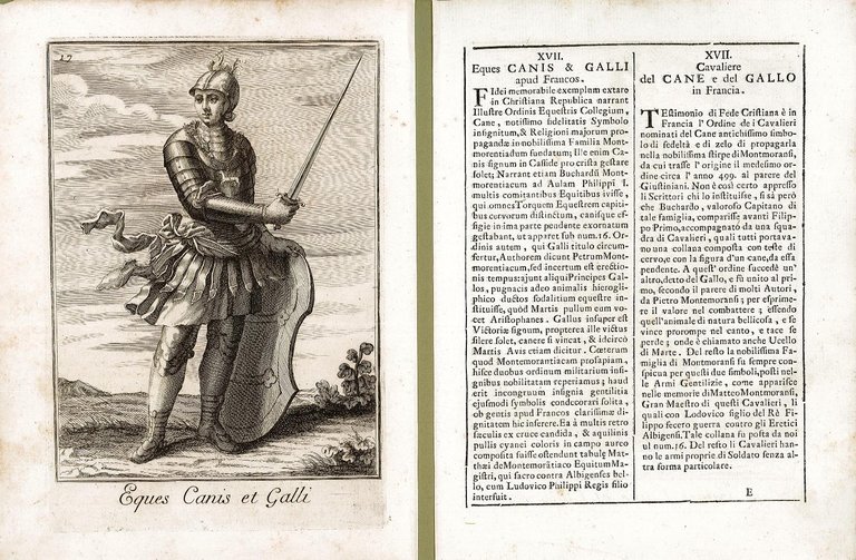 Incisione, antica ed originale, raffigurante il Cavaliere ddel Cane e del Gallo in Francia accompagnata da pagina descrittiva divisa su due colonne, a sinistra in latino ed a desta in italiano, con la storia del costume dell’ordine militare rappresentato. Inserita nell’opera “Catalogo degli ordini equestri e militari. Esposto in imagini, e con breve racconto offerto alla Santità di N.S. Clemente XI dal P. Filippo Bonanni della Compagnia di Giesu” In Roma MDCCXI – Nella Stamperia di Giorgio Placco Intagliatore, e Gettatore di Caratteri à S. Marco. Con licenza de’ Superiori