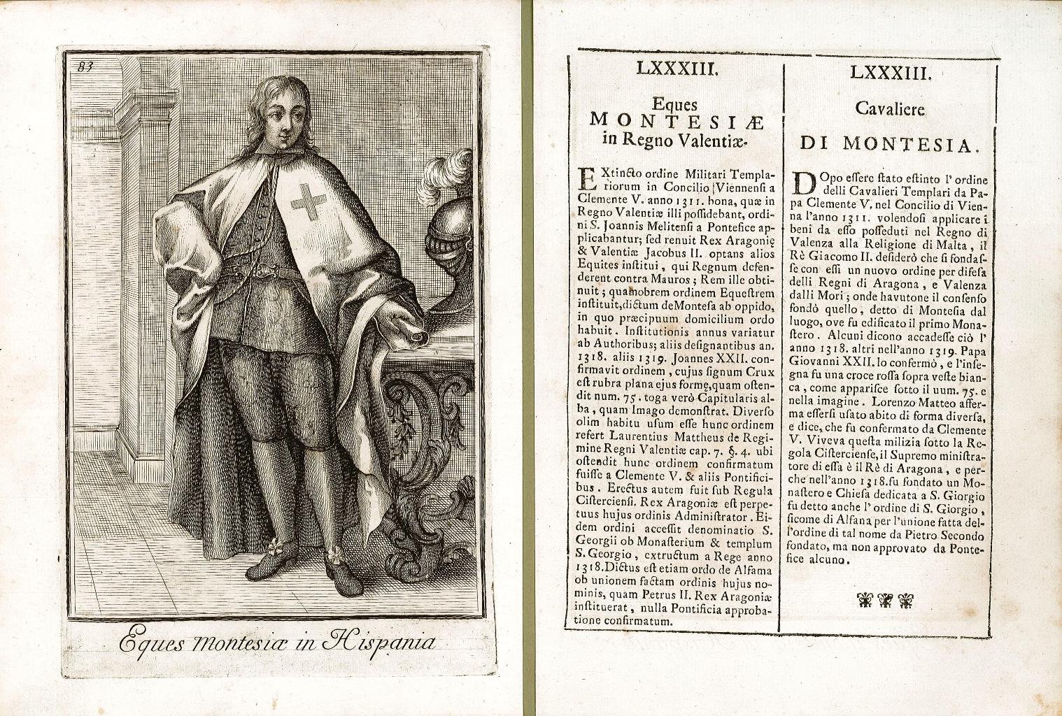 Incisione, antica ed originale, raffigurante il Cavaliere di Montesia accompagnata da pagina descrittiva divisa su due colonne, a sinistra in latino ed a desta in italiano, con la storia del costume dell’ordine militare rappresentato. Inserita nell’opera “Catalogo degli ordini equestri e militari. Esposto in imagini, e con breve racconto offerto alla Santità di N.S. Clemente XI dal P. Filippo Bonanni della Compagnia di Giesu” In Roma MDCCXI – Nella Stamperia di Giorgio Placco Intagliatore, e Gettatore di Caratteri à S. Marco. Con licenza de’ Superiori