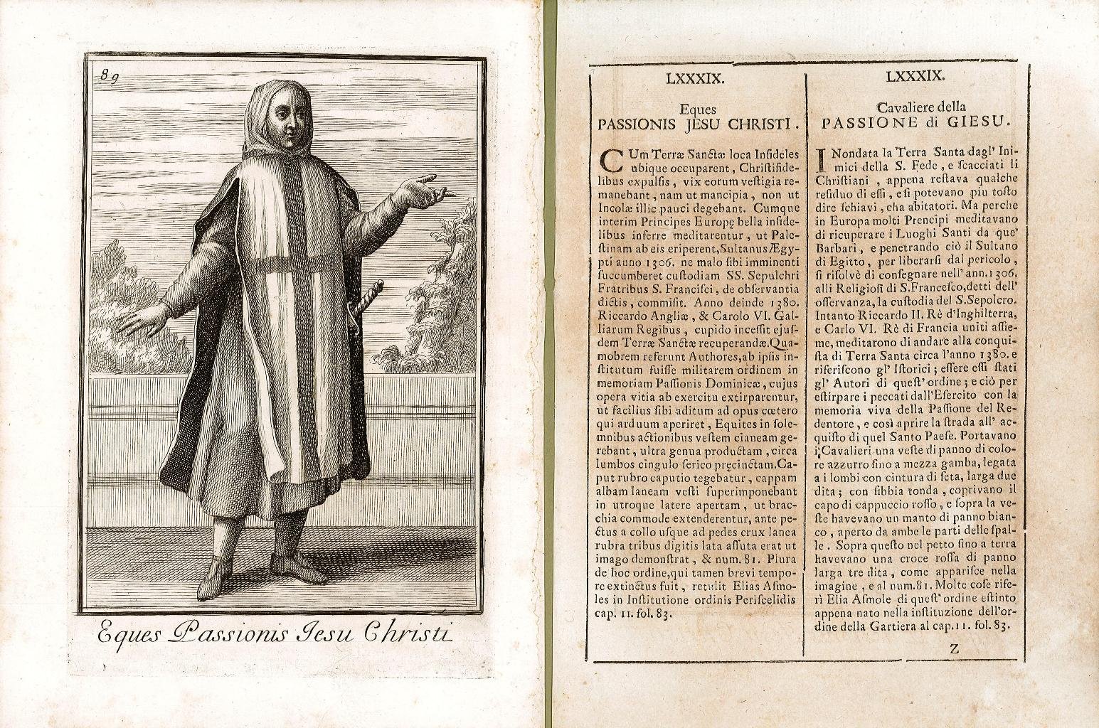 Incisione, antica ed originale, raffigurante il Cavaliere della Passione di Gesù accompagnata da pagina descrittiva divisa su due colonne, a sinistra in latino ed a desta in italiano, con la storia del costume dell’ordine militare rappresentato. Inserita nell’opera “Catalogo degli ordini equestri e militari. Esposto in imagini, e con breve racconto offerto alla Santità di N.S. Clemente XI dal P. Filippo Bonanni della Compagnia di Giesu” In Roma MDCCXI – Nella Stamperia di Giorgio Placco Intagliatore, e Gettatore di Caratteri à S. Marco. Con licenza de’ Superiori