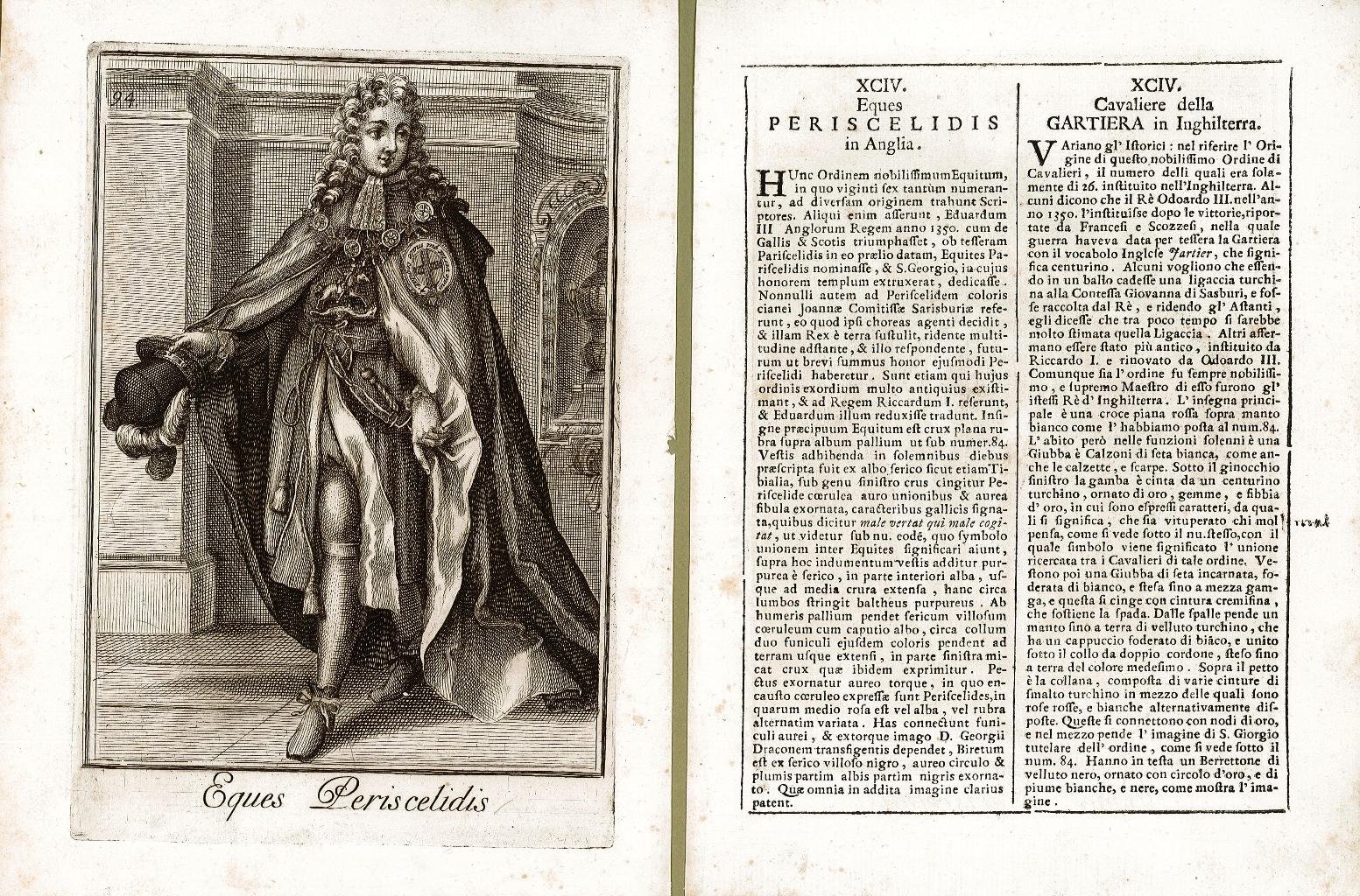 Incisione, antica ed originale, raffigurante il Cavaliere della Gartiera in Inghilterra accompagnata da pagina descrittiva divisa su due colonne, a sinistra in latino ed a desta in italiano, con la storia del costume dell’ordine militare rappresentato. Inserita nell’opera “Catalogo degli ordini equestri e militari. Esposto in imagini, e con breve racconto offerto alla Santità di N.S. Clemente XI dal P. Filippo Bonanni della Compagnia di Giesu” In Roma MDCCXI – Nella Stamperia di Giorgio Placco Intagliatore, e Gettatore di Caratteri à S. Marco. Con licenza de’ Superiori