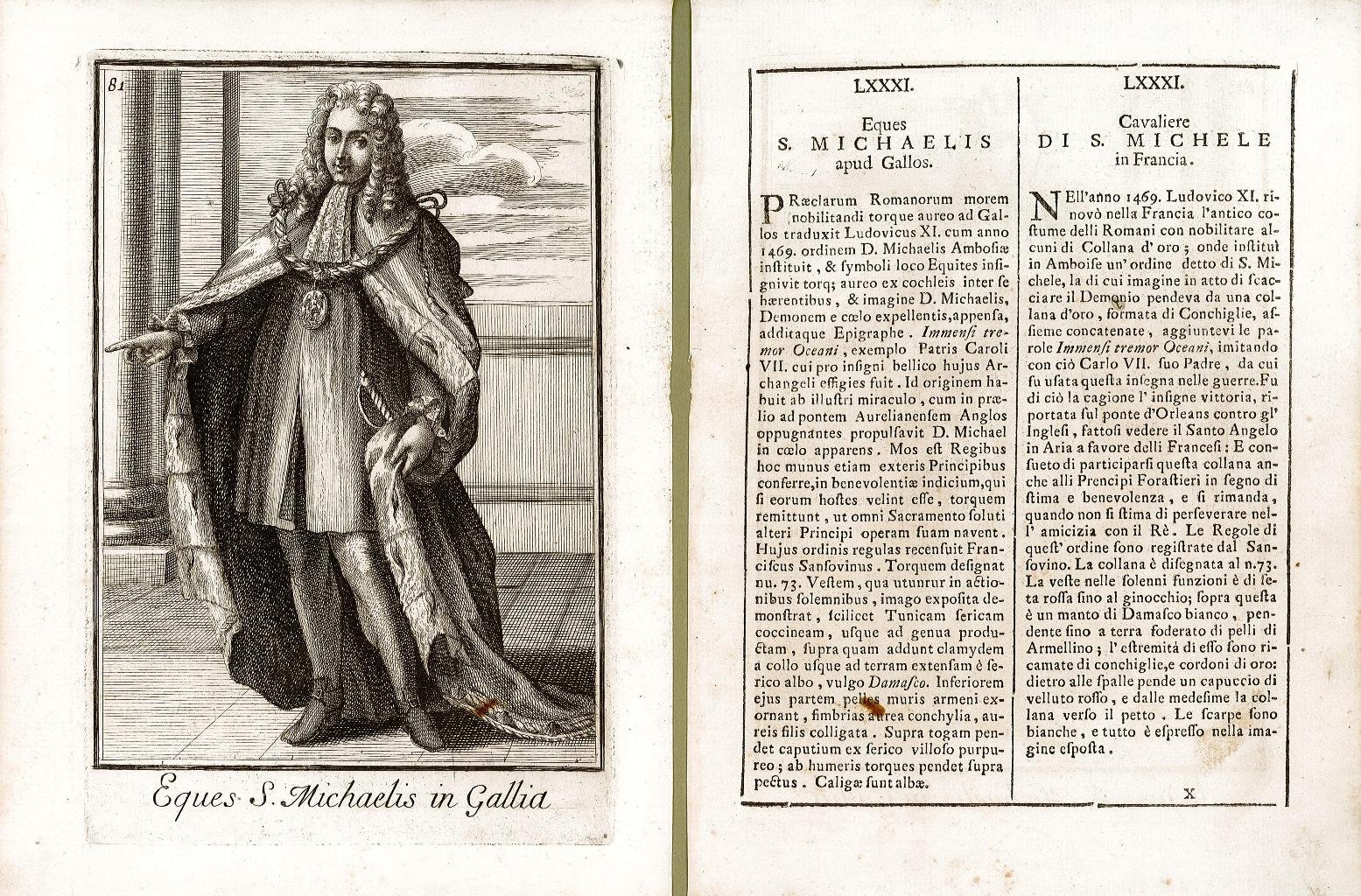 Incisione, antica ed originale, raffigurante il Cavaliere di San michele in Francia accompagnata da pagina descrittiva divisa su due colonne, a sinistra in latino ed a desta in italiano, con la storia del costume dell’ordine militare rappresentato. Inserita nell’opera “Catalogo degli ordini equestri e militari. Esposto in imagini, e con breve racconto offerto alla Santità di N.S. Clemente XI dal P. Filippo Bonanni della Compagnia di Giesu” In Roma MDCCXI – Nella Stamperia di Giorgio Placco Intagliatore, e Gettatore di Caratteri à S. Marco. Con licenza de’ Superiori