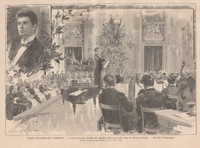 Feste colombiane a Genova - Il gran Concerto diretto dal maestro Mascagni nella sala del Palazzo Ducale - Ritratto di Mascagni