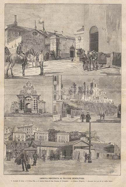 Stampa antica ed originale raffigurante una composizione di quattro vignette: 1. Arsenale di terra - 2. Porta Pila - 3. Antica Chiesa di San Giacomo Carignano - 4. Stazione Brignole. Testo al retro non inerente