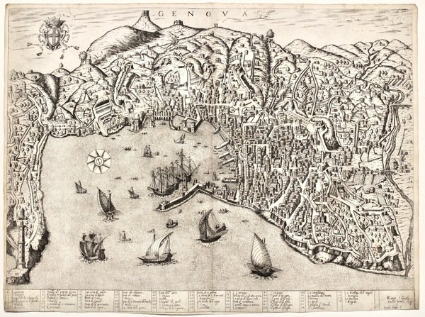 Incisione in rame ad acquaforte e bulino, mm 408x546, eseguita su carta vergellata, firmata in basso a destra in lastra: Romae, Claudij Ducheti formis 1581. Ambr. Bram. f. Rara pianta prospettica censita in soli 6 esemplari in collezioni pubbliche estere. Primo stato su due. Il titolo appare in alto al centro, mentre a sinistra campeggia lo stemma di Genova. In basso, su dieci colonne, una legenda con 58 rimandi. La pianta deriva chiaramente dalla precedente di Lafreri del 1573, la prima ad inaugurare questo genere di pianta prospettica. La lastra di Lafreri, dopo la sua morte era stata ereditata da Stefano Duchetti (Vedi Bifolco-Ronca, Cartografia e topografia italiana del XVI secolo), per cui Claudio Duchetti incaricò probabilmente Brambilla di incidere una nuova lastra. Successivamente fu acquistata da Giovanni Orlandi e ristampata nel 1602 e poi da lui ceduta a Hendrik Van Schoel ed ancora a De Paoli come risulta da un inventario di vendita del 1633. Bifolco-Ronca, Cartografia e topografia italiana del XVI secolo. <BR>