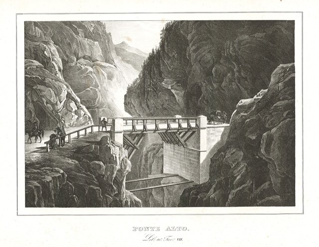 Raffigurazione del Ponte Alto lungo la strada del Passo del Sempione. La scena è animata dal passaggio di alcuni viaggiatori.La stampa in caso di vendità potrà essere consegnata dopo la mostra di Varzo (VB) a fine settembre