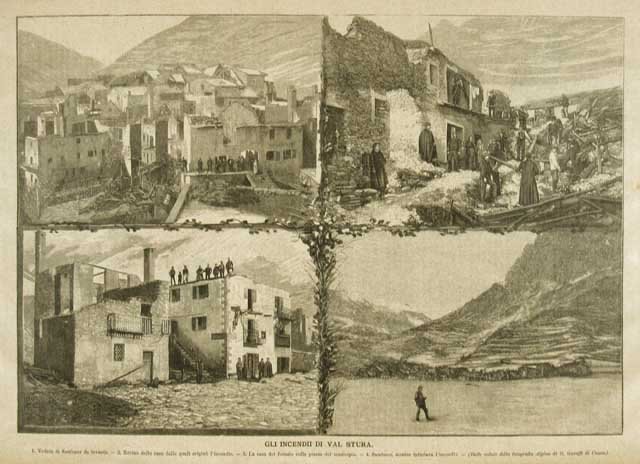 Insieme di vignette raffiguranti il paese di Sambuco e le varie fasi dell'incendio. Testo al verso