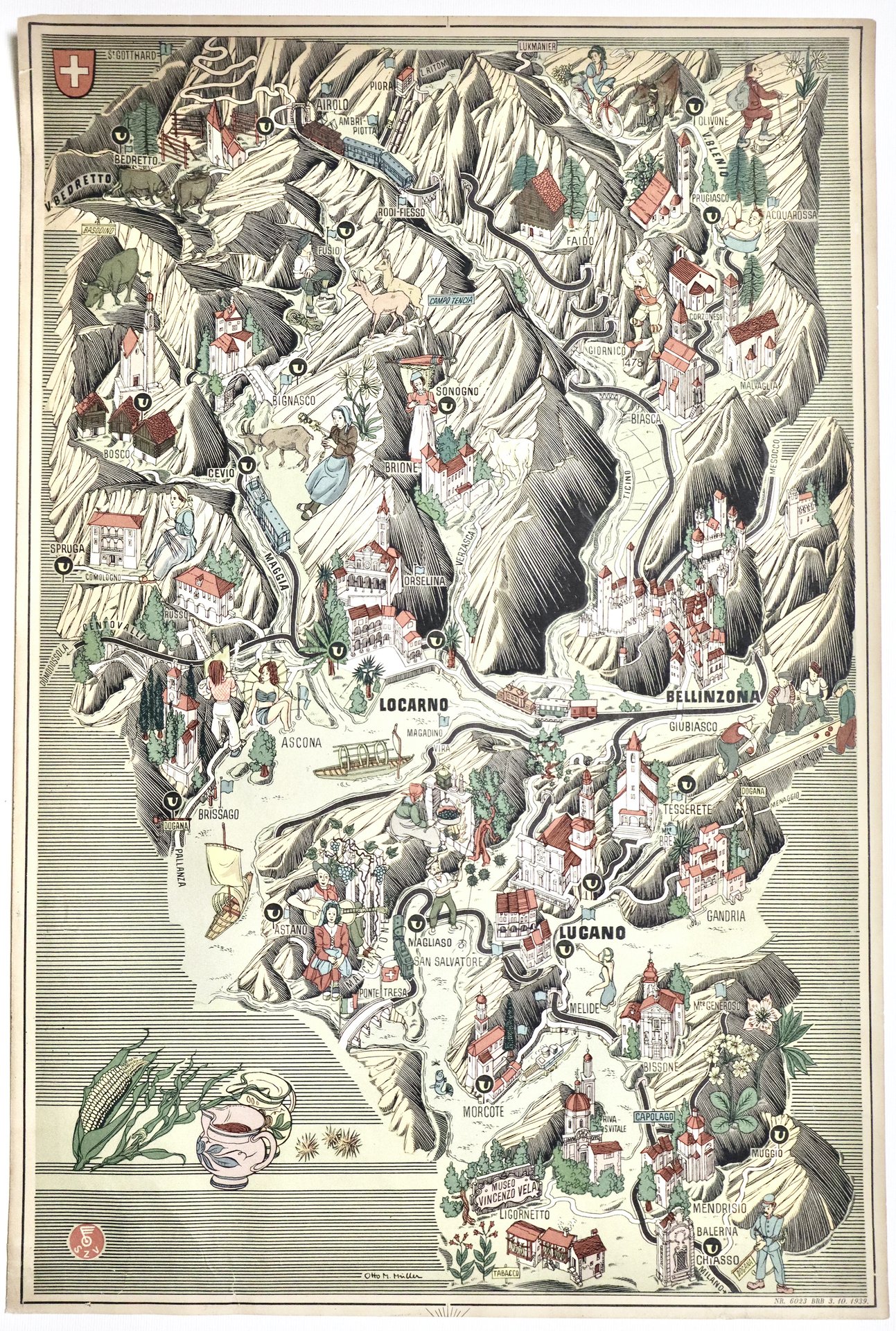 Carta geografica del genere geo-pittorico, mm 460x300, stampata a colori. La carta ci racconta il territorio ed illustra monumenti, luoghi, attività, animali, mezzi di comunicazione che convivono in un fascinosa vista d'insieme. Fa parte di una serie di 8 soggetti dedicati dall'artista a cantoni svizzeri che si promuovevano al turismo. Il titolo (nel nostro esemplare rifilato e mancante) in origine è Vacanze nel Ticino (ripetuto in tedesco, francese, inglese) <BR>