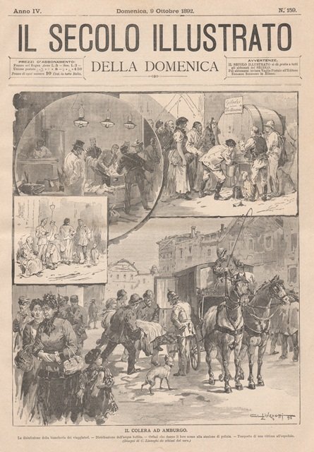 Composizione di vignette: La disinfezione della biancheria dei viaggiatori - Distribuzione dell’acqua bollita - Orfani che danno il loro nome alla stazione di polizia - Trasporto di una vittima all’ospedale. Testo al retro