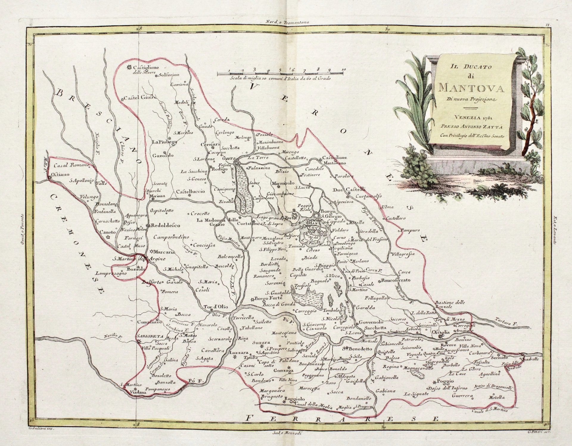 Incisione in rame, mm 325x420, colorata d’epoca. Tratta da “Atlante novissimo”. In alto a dx. un piacevole cartiglio. Ottimo esemplare eccetto una lievissima traccia di arrossamento della carta alla piega centrale. Antonio Zatta (1775-1797) fu uno dei più importanti editori di carte geografiche del tardo XVIII secolo italiano. La sua opera costituisce un importante punto di passaggio tra la cartografia antica e moderna, più attenta all’accuratezza dei dettagli geografici che all’abbellimento estetico ricco di motivi mitologici o d’invenzione, come era quello dell’epoca precedente. La sua opera più importante è Atlante novissimo pubblicato tra il 1775 e il 1789; i disegni delle illustrazioni furono curate da collaboratori quali Giovanni Marco Pitteri, Anton Friedrich Busching, Pietro Antonio Novelli, ed incise da Giuliano Zuliani.