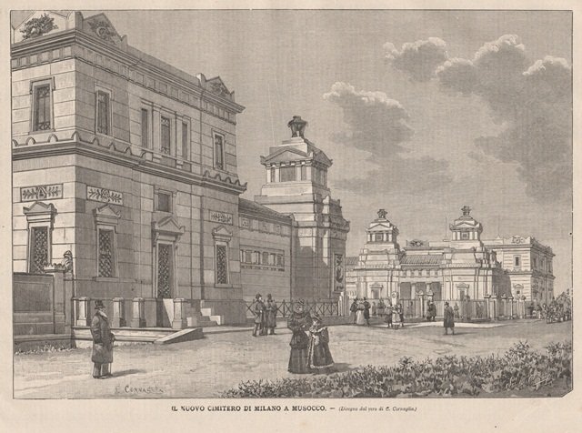 Veduta del nuovo cimitero aperto il 23 ottobre 1895, noto anche come Cimitero Maggiore. Testo al retro