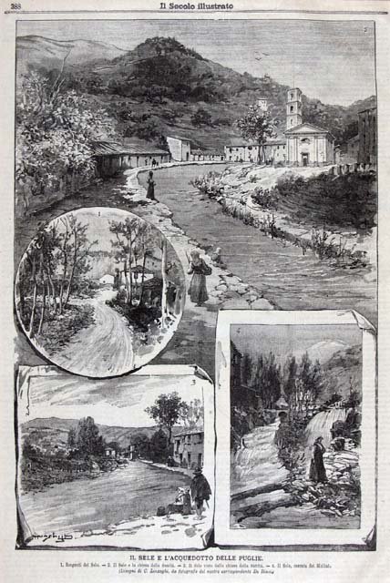 Insieme di vedute raffiguranti la sorgente del fiume Sele, in prossimità del borgo Caposele, e di alcuni tratti del suo corso. Testo al verso