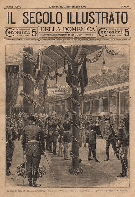 Raffigurazione di Guglielmo II di Germania che riceve la visita di Vittorio Emanuele III di Savoia a Berlino. Testo al retro