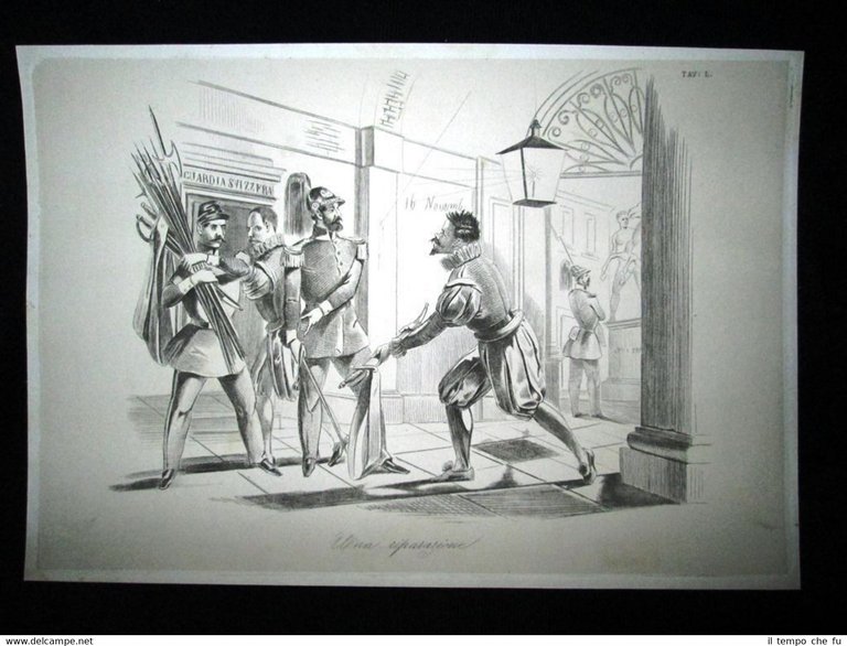 Preziosa ottocentina allegorico - caricaturale Tema: 16 novembre 1848: lo scioglimento della Guardia Svizzera del Quirinale Bella e rara incisione all'acquaforte di satira pungente e dissacrante sui Moti del 1848, detti anche Rivoluzione del '48 o Primavera dei Popoli, che sconvolsero l'Italia e tutta l'Europa nel 1848 e 1849. Estratta dall'introvabile: Don Pirlone a Roma. Memorie di un Italiano dal 1°settembre 1848 al 31 dicembre 1850. Autore: Michelangelo Pinto Editore: Alessandro Fontana Anno di pubblicazione: 1851 DON PIRLONE - 005/L Dimensioni Cm 22,00 x 16,00 Qualora vogliate delle scansioni migliori contattateci, soddisferemo ogni vostra richiesta. Contesto storico: I moti del 1848, detti anche rivoluzione del '48 o Primavera dei popoli furono un'ondata di moti rivoluzionari borghesi che sconvolsero l'Europa nel 1848 e nel 1849. Scopo dei moti fu abbattere i governi della Restaurazione per sostituirli con governi liberali. Il loro impatto storico fu così profondo e violento che nel linguaggio corrente è entrata in uso l'espressione «fare un quarantotto» per sottintendere una improvvisa confusione e scompiglio. La prima agitazione europea del 1848 si verificò in Italia: la rivoluzione siciliana che esplose il 12 gennaio di quell'anno, che rappresentò la prima miccia dell'esplosione europea. L'insurrezione siciliana, infatti, spinse in un primo momento i Borbone a concedere il ritorno nell'Isola alla costituzione del 1812. Seguì una rivoluzione a Napoli, il 27, che costrinse, due giorni dopo, Ferdinando II a promettere una Costituzione, promulgata l'11 febbraio. Lo stesso 11 febbraio Leopoldo II di Toscana, cugino primo dell'imperatore Ferdinando I d'Austria, concesse la Costituzione, nella generale approvazione dei suoi sudditi. L'esempio borbonico fu seguito da Carlo Alberto di Savoia con lo Statuto Albertino e da Papa Pio IX con lo Statuto Fondamentale. Solo il re piemontese mantenne però lo Statuto. In Sicilia il parlamento proclamò in marzo l'indipendenza, che sarebbe durata fino al maggio 1849. Nel napoletano la concessione e la successiva repressione delle libertà costituzionali, portò dal maggio al settembre di quell'anno a una serie di moti. In tutto il Regno Lombardo-Veneto scoppiarono rivolte, come le Cinque giornate di Milano che sfociarono nella prima guerra di indipendenza. Nello Stato Pontificio una rivolta interna estromise papa Pio IX dai suoi poteri temporali e portò alla costituzione della Repubblica Romana. La rivoluzione delle Cinque giornate di Milano e altre proteste indussero il Re Carlo Alberto a dichiarare guerra all'Austria. Le truppe vennero presto sconfitte e solo quelle francesi poterono far retrocedere gli austriaci. La successiva ascesa al trono di Vittorio Emanuele II fece del Piemonte il motore propulsore del processo di unificazione italiana che tuttavia si sarebbe ottenuto solo nel 1861. Per quanto i Moti del '48 furono sedati abbastanza velocemente, le vittime furono decine di migliaia: il destino della democrazia europea ci è sfuggito di mano dichiarerà Pierre-Joseph Proudhon. Gli storici concordano che la Primavera dei popoli fu, alla fin fine, soprattutto un sanguinoso fallimento, se si eccettua la concessione dello Statuto Albertino nel Regno di Sardegna da parte di Carlo Alberto di Savoia, l'unica costituzione non revocata di quelle concesse o votate nel 1848-49. Vi furono tuttavia radicali e notevoli effetti a lungo termine: Germania e Italia sarebbero presto arrivate all'unificazione facendo leva anche sulla necessità di autodeterminazione dei popoli. Analogamente l'Ungheria sarebbe giunta ad un parziale riconoscimento della propria autonomia (a discapito della popolazione slava) grazie all'Ausgleich del 1867. In Prussia e Austria fu abolito il feudalesimo, mentre in Russia fu eliminata la servitù della gleba nel 1861. Tavola allegorico - caricaturale sullo stato dell'Italia del tempo, incisione su rame ricca di significato e rappresentazione mediante satirica dissacrante della condizione della nostra penisola oppressa. Le tavole dell'opera furono in parte riprese dal giornale romano Don Pirlone, quotidiano, uscito dal 1 settembre 1848 al 2 luglio 1849 (con una interruzione dl 29 aprile al 7 maggio 1849), ma in parte furono realizzate appositamente per questa opera. Tra gli incisori sono presenti anche i nomi di Ratti, Vaiani, Monneret, Gallucci, Pichi, Masutti. Il titolo Don Pirlone deriva quasi sicuramente da una maschera creata dallo scrittore satirico Girolamo Gigli (1660 - 1722). Si trattava di una specie di Tartufo molieresco, ispirato ad una figura reale, il canonico Feliciati di Sarteano. Nei tre volumi l'avvocato Michelangiolo Pinto raccolse tutto il pubblicato del giornale, che fu il più temuto e allo stesso tempo il più apprezzato tra i molteplici giornali satirici che si pubblicavano nella Roma di Pio IX all'epoca delle grandi riforme volute dal Papa. I romani gli dedicarono perfino una canzone (Davanti un numero di gran persone - che mi salutano