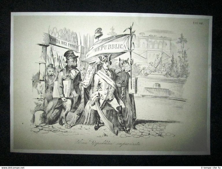 Preziosa ottocentina allegorico - caricaturale Tema: Il Costituzionale Romano, il Labaro e il Cassandrino: tre giornali pubblicati per tentar di convincere il popolo di macchinazioni tenebrose e segrete congiure finalizzate a spodestar Papa Pio IX e proclamar la Repubblica. Ma l'attento popolo non fu lento a scorgere il tranello Bella e rara incisione all'acquaforte di satira pungente e dissacrante sui Moti del 1848, detti anche Rivoluzione del '48 o Primavera dei Popoli, che sconvolsero l'Italia e tutta l'Europa nel 1848 e 1849. Estratta dall'introvabile: Don Pirlone a Roma. Memorie di un Italiano dal 1°settembre 1848 al 31 dicembre 1850. Autore: Michelangelo Pinto Editore: Alessandro Fontana Anno di pubblicazione: 1851 DON PIRLONE - 001/VIII Dimensioni Cm 22,00 x 16,00 Qualora vogliate delle scansioni migliori contattateci, soddisferemo ogni vostra richiesta. Contesto storico: I moti del 1848, detti anche rivoluzione del '48 o Primavera dei popoli furono un'ondata di moti rivoluzionari borghesi che sconvolsero l'Europa nel 1848 e nel 1849. Scopo dei moti fu abbattere i governi della Restaurazione per sostituirli con governi liberali. Il loro impatto storico fu così profondo e violento che nel linguaggio corrente è entrata in uso l'espressione «fare un quarantotto» per sottintendere una improvvisa confusione e scompiglio. La prima agitazione europea del 1848 si verificò in Italia: la rivoluzione siciliana che esplose il 12 gennaio di quell'anno, che rappresentò la prima miccia dell'esplosione europea. L'insurrezione siciliana, infatti, spinse in un primo momento i Borbone a concedere il ritorno nell'Isola alla costituzione del 1812. Seguì una rivoluzione a Napoli, il 27, che costrinse, due giorni dopo, Ferdinando II a promettere una Costituzione, promulgata l'11 febbraio. Lo stesso 11 febbraio Leopoldo II di Toscana, cugino primo dell'imperatore Ferdinando I d'Austria, concesse la Costituzione, nella generale approvazione dei suoi sudditi. L'esempio borbonico fu seguito da Carlo Alberto di Savoia con lo Statuto Albertino e da Papa Pio IX con lo Statuto Fondamentale. Solo il re piemontese mantenne però lo Statuto. In Sicilia il parlamento proclamò in marzo l'indipendenza, che sarebbe durata fino al maggio 1849. Nel napoletano la concessione e la successiva repressione delle libertà costituzionali, portò dal maggio al settembre di quell'anno a una serie di moti. In tutto il Regno Lombardo-Veneto scoppiarono rivolte, come le Cinque giornate di Milano che sfociarono nella prima guerra di indipendenza. Nello Stato Pontificio una rivolta interna estromise papa Pio IX dai suoi poteri temporali e portò alla costituzione della Repubblica Romana. La rivoluzione delle Cinque giornate di Milano e altre proteste indussero il Re Carlo Alberto a dichiarare guerra all'Austria. Le truppe vennero presto sconfitte e solo quelle francesi poterono far retrocedere gli austriaci. La successiva ascesa al trono di Vittorio Emanuele II fece del Piemonte il motore propulsore del processo di unificazione italiana che tuttavia si sarebbe ottenuto solo nel 1861. Per quanto i Moti del '48 furono sedati abbastanza velocemente, le vittime furono decine di migliaia: il destino della democrazia europea ci è sfuggito di mano dichiarerà Pierre-Joseph Proudhon. Gli storici concordano che la Primavera dei popoli fu, alla fin fine, soprattutto un sanguinoso fallimento, se si eccettua la concessione dello Statuto Albertino nel Regno di Sardegna da parte di Carlo Alberto di Savoia, l'unica costituzione non revocata di quelle concesse o votate nel 1848-49. Vi furono tuttavia radicali e notevoli effetti a lungo termine: Germania e Italia sarebbero presto arrivate all'unificazione facendo leva anche sulla necessità di autodeterminazione dei popoli. Analogamente l'Ungheria sarebbe giunta ad un parziale riconoscimento della propria autonomia (a discapito della popolazione slava) grazie all'Ausgleich del 1867. In Prussia e Austria fu abolito il feudalesimo, mentre in Russia fu eliminata la servitù della gleba nel 1861. Tavola allegorico - caricaturale sullo stato dell'Italia del tempo, incisione su rame ricca di significato e rappresentazione mediante satirica dissacrante della condizione della nostra penisola oppressa. Le tavole dell'opera furono in parte riprese dal giornale romano Don Pirlone, quotidiano, uscito dal 1 settembre 1848 al 2 luglio 1849 (con una interruzione dl 29 aprile al 7 maggio 1849), ma in parte furono realizzate appositamente per questa opera. Tra gli incisori sono presenti anche i nomi di Ratti, Vaiani, Monneret, Gallucci, Pichi, Masutti. Il titolo Don Pirlone deriva quasi sicuramente da una maschera creata dallo scrittore satirico Girolamo Gigli (1660 - 1722). Si trattava di una specie di Tartufo molieresco, ispirato ad una figura reale, il canonico Feliciati di Sarteano. Nei tre volumi l'avvocato Michelangiolo Pinto raccolse tutto il pubblicato del giornale, che fu il più temuto e allo stesso tempo il più apprezzato tra i molt