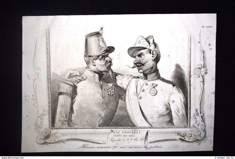 Preziosa ottocentina allegorico - caricaturale Tema: L'alleanza tra l'esercito francese e quello croato, benedetta da Papa Pio IX, alla conquista della Repubblica Romana Bella e rara incisione all'acquaforte di satira pungente e dissacrante sui Moti del 1848, detti anche Rivoluzione del '48 o Primavera dei Popoli, che sconvolsero l'Italia e tutta l'Europa nel 1848 e 1849. Estratta dall'introvabile: Don Pirlone a Roma. Memorie di un Italiano dal 1°settembre 1848 al 31 dicembre 1850. Autore: Michelangelo Pinto Editore: Alessandro Fontana Anno di pubblicazione: 1851 DON PIRLONE - 011/CLIV Dimensioni Cm 22,00 x 16,00 Qualora vogliate delle scansioni migliori contattateci, soddisferemo ogni vostra richiesta. Contesto storico: I moti del 1848, detti anche rivoluzione del '48 o Primavera dei popoli furono un'ondata di moti rivoluzionari borghesi che sconvolsero l'Europa nel 1848 e nel 1849. Scopo dei moti fu abbattere i governi della Restaurazione per sostituirli con governi liberali. Il loro impatto storico fu così profondo e violento che nel linguaggio corrente è entrata in uso l'espressione «fare un quarantotto» per sottintendere una improvvisa confusione e scompiglio. La prima agitazione europea del 1848 si verificò in Italia: la rivoluzione siciliana che esplose il 12 gennaio di quell'anno, che rappresentò la prima miccia dell'esplosione europea. L'insurrezione siciliana, infatti, spinse in un primo momento i Borbone a concedere il ritorno nell'Isola alla costituzione del 1812. Seguì una rivoluzione a Napoli, il 27, che costrinse, due giorni dopo, Ferdinando II a promettere una Costituzione, promulgata l'11 febbraio. Lo stesso 11 febbraio Leopoldo II di Toscana, cugino primo dell'imperatore Ferdinando I d'Austria, concesse la Costituzione, nella generale approvazione dei suoi sudditi. L'esempio borbonico fu seguito da Carlo Alberto di Savoia con lo Statuto Albertino e da Papa Pio IX con lo Statuto Fondamentale. Solo il re piemontese mantenne però lo Statuto. In Sicilia il parlamento proclamò in marzo l'indipendenza, che sarebbe durata fino al maggio 1849. Nel napoletano la concessione e la successiva repressione delle libertà costituzionali, portò dal maggio al settembre di quell'anno a una serie di moti. In tutto il Regno Lombardo-Veneto scoppiarono rivolte, come le Cinque giornate di Milano che sfociarono nella prima guerra di indipendenza. Nello Stato Pontificio una rivolta interna estromise papa Pio IX dai suoi poteri temporali e portò alla costituzione della Repubblica Romana. La rivoluzione delle Cinque giornate di Milano e altre proteste indussero il Re Carlo Alberto a dichiarare guerra all'Austria. Le truppe vennero presto sconfitte e solo quelle francesi poterono far retrocedere gli austriaci. La successiva ascesa al trono di Vittorio Emanuele II fece del Piemonte il motore propulsore del processo di unificazione italiana che tuttavia si sarebbe ottenuto solo nel 1861. Per quanto i Moti del '48 furono sedati abbastanza velocemente, le vittime furono decine di migliaia: il destino della democrazia europea ci è sfuggito di mano dichiarerà Pierre-Joseph Proudhon. Gli storici concordano che la Primavera dei popoli fu, alla fin fine, soprattutto un sanguinoso fallimento, se si eccettua la concessione dello Statuto Albertino nel Regno di Sardegna da parte di Carlo Alberto di Savoia, l'unica costituzione non revocata di quelle concesse o votate nel 1848-49. Vi furono tuttavia radicali e notevoli effetti a lungo termine: Germania e Italia sarebbero presto arrivate all'unificazione facendo leva anche sulla necessità di autodeterminazione dei popoli. Analogamente l'Ungheria sarebbe giunta ad un parziale riconoscimento della propria autonomia (a discapito della popolazione slava) grazie all'Ausgleich del 1867. In Prussia e Austria fu abolito il feudalesimo, mentre in Russia fu eliminata la servitù della gleba nel 1861. Tavola allegorico - caricaturale sullo stato dell'Italia del tempo, incisione su rame ricca di significato e rappresentazione mediante satirica dissacrante della condizione della nostra penisola oppressa. Le tavole dell'opera furono in parte riprese dal giornale romano Don Pirlone, quotidiano, uscito dal 1 settembre 1848 al 2 luglio 1849 (con una interruzione dl 29 aprile al 7 maggio 1849), ma in parte furono realizzate appositamente per questa opera. Tra gli incisori sono presenti anche i nomi di Ratti, Vaiani, Monneret, Gallucci, Pichi, Masutti. Il titolo Don Pirlone deriva quasi sicuramente da una maschera creata dallo scrittore satirico Girolamo Gigli (1660 - 1722). Si trattava di una specie di Tartufo molieresco, ispirato ad una figura reale, il canonico Feliciati di Sarteano. Nei tre volumi l'avvocato Michelangiolo Pinto raccolse tutto il pubblicato del giornale, che fu il più temuto e allo stesso tempo il più apprezzato tra i molteplici giornali satirici che si pubblicavano nella Roma di Pio IX all'epoca delle grandi riforme volute dal Papa. I romani gli dedicarono perfino una canzone (Da