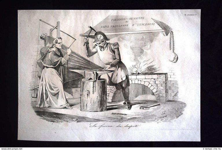 Preziosa ottocentina allegorico - caricaturale Tema: Francia, la fucina dei despoti: Napoleone III vende a Pio IX la schiavitù delle province romane Bella e rara incisione all'acquaforte di satira pungente e dissacrante sui Moti del 1848, detti anche Rivoluzione del '48 o Primavera dei Popoli, che sconvolsero l'Italia e tutta l'Europa nel 1848 e 1849. Estratta dall'introvabile: Don Pirlone a Roma. Memorie di un Italiano dal 1°settembre 1848 al 31 dicembre 1850. Autore: Michelangelo Pinto Editore: Alessandro Fontana Anno di pubblicazione: 1851 DON PIRLONE - 013/CLXXXIII Dimensioni Cm 22,00 x 16,00 Qualora vogliate delle scansioni migliori contattateci, soddisferemo ogni vostra richiesta. Contesto storico: I moti del 1848, detti anche rivoluzione del '48 o Primavera dei popoli furono un'ondata di moti rivoluzionari borghesi che sconvolsero l'Europa nel 1848 e nel 1849. Scopo dei moti fu abbattere i governi della Restaurazione per sostituirli con governi liberali. Il loro impatto storico fu così profondo e violento che nel linguaggio corrente è entrata in uso l'espressione «fare un quarantotto» per sottintendere una improvvisa confusione e scompiglio. La prima agitazione europea del 1848 si verificò in Italia: la rivoluzione siciliana che esplose il 12 gennaio di quell'anno, che rappresentò la prima miccia dell'esplosione europea. L'insurrezione siciliana, infatti, spinse in un primo momento i Borbone a concedere il ritorno nell'Isola alla costituzione del 1812. Seguì una rivoluzione a Napoli, il 27, che costrinse, due giorni dopo, Ferdinando II a promettere una Costituzione, promulgata l'11 febbraio. Lo stesso 11 febbraio Leopoldo II di Toscana, cugino primo dell'imperatore Ferdinando I d'Austria, concesse la Costituzione, nella generale approvazione dei suoi sudditi. L'esempio borbonico fu seguito da Carlo Alberto di Savoia con lo Statuto Albertino e da Papa Pio IX con lo Statuto Fondamentale. Solo il re piemontese mantenne però lo Statuto. In Sicilia il parlamento proclamò in marzo l'indipendenza, che sarebbe durata fino al maggio 1849. Nel napoletano la concessione e la successiva repressione delle libertà costituzionali, portò dal maggio al settembre di quell'anno a una serie di moti. In tutto il Regno Lombardo-Veneto scoppiarono rivolte, come le Cinque giornate di Milano che sfociarono nella prima guerra di indipendenza. Nello Stato Pontificio una rivolta interna estromise papa Pio IX dai suoi poteri temporali e portò alla costituzione della Repubblica Romana. La rivoluzione delle Cinque giornate di Milano e altre proteste indussero il Re Carlo Alberto a dichiarare guerra all'Austria. Le truppe vennero presto sconfitte e solo quelle francesi poterono far retrocedere gli austriaci. La successiva ascesa al trono di Vittorio Emanuele II fece del Piemonte il motore propulsore del processo di unificazione italiana che tuttavia si sarebbe ottenuto solo nel 1861. Per quanto i Moti del '48 furono sedati abbastanza velocemente, le vittime furono decine di migliaia: il destino della democrazia europea ci è sfuggito di mano dichiarerà Pierre-Joseph Proudhon. Gli storici concordano che la Primavera dei popoli fu, alla fin fine, soprattutto un sanguinoso fallimento, se si eccettua la concessione dello Statuto Albertino nel Regno di Sardegna da parte di Carlo Alberto di Savoia, l'unica costituzione non revocata di quelle concesse o votate nel 1848-49. Vi furono tuttavia radicali e notevoli effetti a lungo termine: Germania e Italia sarebbero presto arrivate all'unificazione facendo leva anche sulla necessità di autodeterminazione dei popoli. Analogamente l'Ungheria sarebbe giunta ad un parziale riconoscimento della propria autonomia (a discapito della popolazione slava) grazie all'Ausgleich del 1867. In Prussia e Austria fu abolito il feudalesimo, mentre in Russia fu eliminata la servitù della gleba nel 1861. Tavola allegorico - caricaturale sullo stato dell'Italia del tempo, incisione su rame ricca di significato e rappresentazione mediante satirica dissacrante della condizione della nostra penisola oppressa. Le tavole dell'opera furono in parte riprese dal giornale romano Don Pirlone, quotidiano, uscito dal 1 settembre 1848 al 2 luglio 1849 (con una interruzione dl 29 aprile al 7 maggio 1849), ma in parte furono realizzate appositamente per questa opera. Tra gli incisori sono presenti anche i nomi di Ratti, Vaiani, Monneret, Gallucci, Pichi, Masutti. Il titolo Don Pirlone deriva quasi sicuramente da una maschera creata dallo scrittore satirico Girolamo Gigli (1660 - 1722). Si trattava di una specie di Tartufo molieresco, ispirato ad una figura reale, il canonico Feliciati di Sarteano. Nei tre volumi l'avvocato Michelangiolo Pinto raccolse tutto il pubblicato del giornale, che fu il più temuto e allo stesso tempo il più apprezzato tra i molteplici giornali satirici che si pubblicavano nella Roma di Pio IX all'epoca delle grandi riforme volute dal Papa. I romani gli dedicarono perfino una canzone (Davanti un numero d