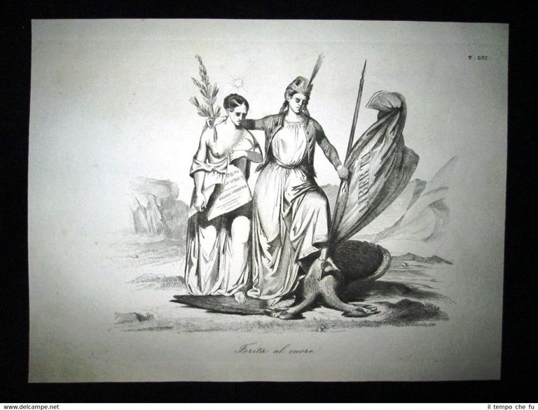 Preziosa ottocentina allegorico - caricaturale Tema: Dopo aver inflitto un colpo al cuore dell'Austria, l'Ungheria si stringeva in un'alleanza all'Italia moltiplicando le proprie truppe alla frontiera e incoraggiando i molti stati germanici, oppressi dagli Asburgo, all'insurrezione Bella e rara incisione all'acquaforte di satira pungente e dissacrante sui Moti del 1848, detti anche Rivoluzione del '48 o Primavera dei Popoli, che sconvolsero l'Italia e tutta l'Europa nel 1848 e 1849. Estratta dall'introvabile: Don Pirlone a Roma. Memorie di un Italiano dal 1°settembre 1848 al 31 dicembre 1850. Autore: Michelangelo Pinto Editore: Alessandro Fontana Anno di pubblicazione: 1851 DON PIRLONE - 005/LVI Dimensioni Cm 22,00 x 16,00 Qualora vogliate delle scansioni migliori contattateci, soddisferemo ogni vostra richiesta. Contesto storico: I moti del 1848, detti anche rivoluzione del '48 o Primavera dei popoli furono un'ondata di moti rivoluzionari borghesi che sconvolsero l'Europa nel 1848 e nel 1849. Scopo dei moti fu abbattere i governi della Restaurazione per sostituirli con governi liberali. Il loro impatto storico fu così profondo e violento che nel linguaggio corrente è entrata in uso l'espressione «fare un quarantotto» per sottintendere una improvvisa confusione e scompiglio. La prima agitazione europea del 1848 si verificò in Italia: la rivoluzione siciliana che esplose il 12 gennaio di quell'anno, che rappresentò la prima miccia dell'esplosione europea. L'insurrezione siciliana, infatti, spinse in un primo momento i Borbone a concedere il ritorno nell'Isola alla costituzione del 1812. Seguì una rivoluzione a Napoli, il 27, che costrinse, due giorni dopo, Ferdinando II a promettere una Costituzione, promulgata l'11 febbraio. Lo stesso 11 febbraio Leopoldo II di Toscana, cugino primo dell'imperatore Ferdinando I d'Austria, concesse la Costituzione, nella generale approvazione dei suoi sudditi. L'esempio borbonico fu seguito da Carlo Alberto di Savoia con lo Statuto Albertino e da Papa Pio IX con lo Statuto Fondamentale. Solo il re piemontese mantenne però lo Statuto. In Sicilia il parlamento proclamò in marzo l'indipendenza, che sarebbe durata fino al maggio 1849. Nel napoletano la concessione e la successiva repressione delle libertà costituzionali, portò dal maggio al settembre di quell'anno a una serie di moti. In tutto il Regno Lombardo-Veneto scoppiarono rivolte, come le Cinque giornate di Milano che sfociarono nella prima guerra di indipendenza. Nello Stato Pontificio una rivolta interna estromise papa Pio IX dai suoi poteri temporali e portò alla costituzione della Repubblica Romana. La rivoluzione delle Cinque giornate di Milano e altre proteste indussero il Re Carlo Alberto a dichiarare guerra all'Austria. Le truppe vennero presto sconfitte e solo quelle francesi poterono far retrocedere gli austriaci. La successiva ascesa al trono di Vittorio Emanuele II fece del Piemonte il motore propulsore del processo di unificazione italiana che tuttavia si sarebbe ottenuto solo nel 1861. Per quanto i Moti del '48 furono sedati abbastanza velocemente, le vittime furono decine di migliaia: il destino della democrazia europea ci è sfuggito di mano dichiarerà Pierre-Joseph Proudhon. Gli storici concordano che la Primavera dei popoli fu, alla fin fine, soprattutto un sanguinoso fallimento, se si eccettua la concessione dello Statuto Albertino nel Regno di Sardegna da parte di Carlo Alberto di Savoia, l'unica costituzione non revocata di quelle concesse o votate nel 1848-49. Vi furono tuttavia radicali e notevoli effetti a lungo termine: Germania e Italia sarebbero presto arrivate all'unificazione facendo leva anche sulla necessità di autodeterminazione dei popoli. Analogamente l'Ungheria sarebbe giunta ad un parziale riconoscimento della propria autonomia (a discapito della popolazione slava) grazie all'Ausgleich del 1867. In Prussia e Austria fu abolito il feudalesimo, mentre in Russia fu eliminata la servitù della gleba nel 1861. Tavola allegorico - caricaturale sullo stato dell'Italia del tempo, incisione su rame ricca di significato e rappresentazione mediante satirica dissacrante della condizione della nostra penisola oppressa. Le tavole dell'opera furono in parte riprese dal giornale romano Don Pirlone, quotidiano, uscito dal 1 settembre 1848 al 2 luglio 1849 (con una interruzione dl 29 aprile al 7 maggio 1849), ma in parte furono realizzate appositamente per questa opera. Tra gli incisori sono presenti anche i nomi di Ratti, Vaiani, Monneret, Gallucci, Pichi, Masutti. Il titolo Don Pirlone deriva quasi sicuramente da una maschera creata dallo scrittore satirico Girolamo Gigli (1660 - 1722). Si trattava di una specie di Tartufo molieresco, ispirato ad una figura reale, il canonico Feliciati di Sarteano. Nei tre volumi l'avvocato Michelangiolo Pinto raccolse tutto il pubblicato del giornale, che fu il più temuto e allo stesso tempo il più apprezzato tra i molteplici giornali satirici che si pubblicavano nell