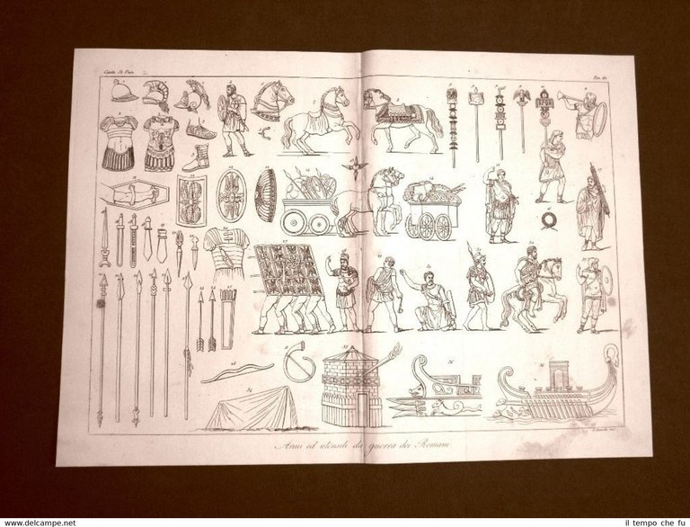 Incisione in rame del 1846 Roma Armi e soldati romani Bonatti - Cantù