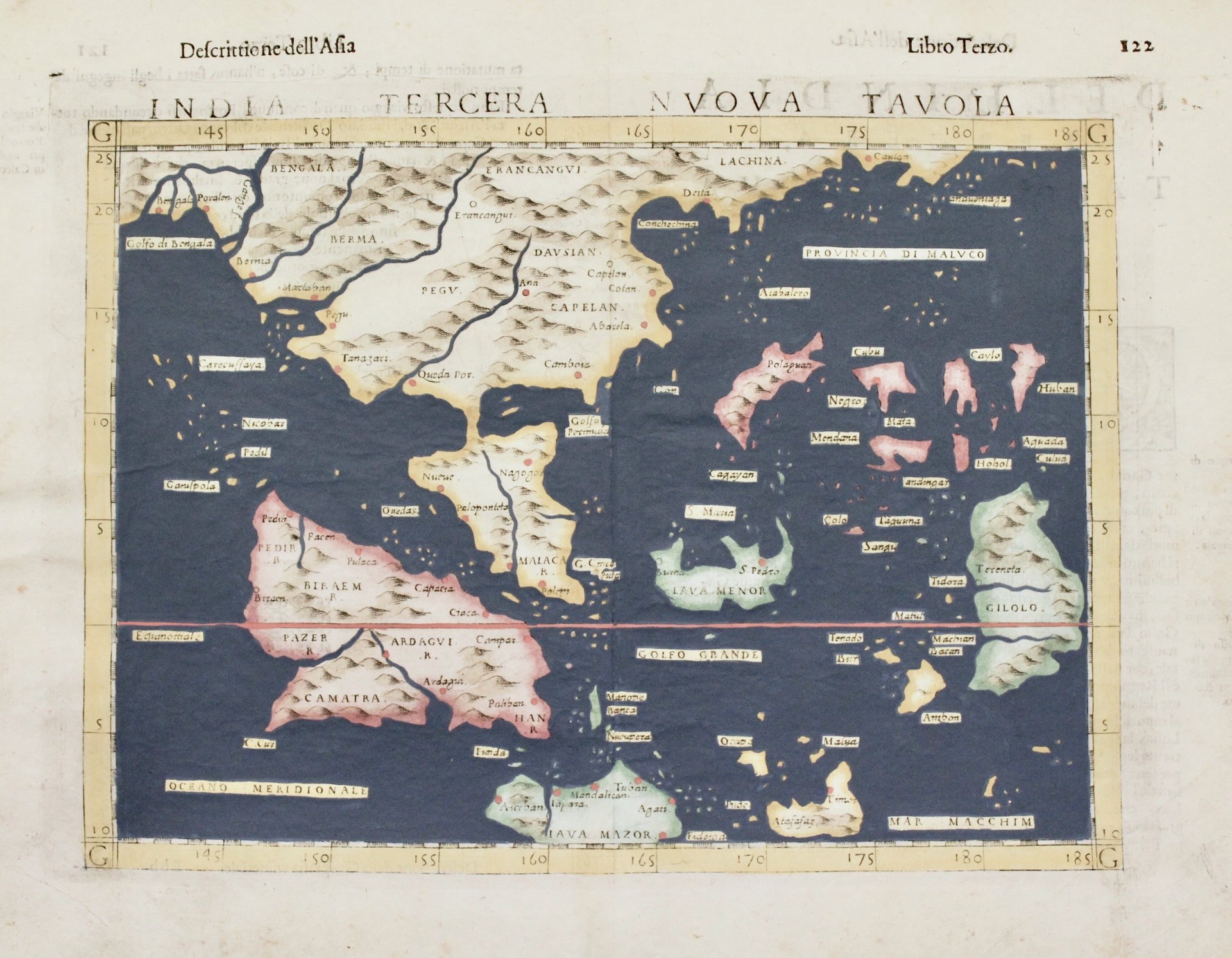 Incisione in rame, colorata a mano, mm 190x263, Bell’esemplare tratto dall’edizione veneziana della “Geographia” curata inizialmente da Ruscelli, qui nell’edizione a cura di Moleto e pubblicata dagli eredi Sessa, terza edizione nella traduzione di Ruscelli. La carta è basata su quella di Gastaldi del 1548 pubblicata nella sua edizione della “Geografia. Questa terza edizione, risulta la più rara fra i tre stati, ed è significativamente rielaborata e include numerosi abbellimenti e aggiunte di toponimi e una topografia rivisitata, come elemento decorativo, le armi gentilizie in basso a sinistra. Si tratta anche di una delle prime mappe della regione. Girolamo Ruscelli (1500-1566) nasce a Viterbo ed è un importante scrittore ed editore, che dopo aver studiato a Padova trascorse la propria carriera fra Roma e Napoli, dove morì.
