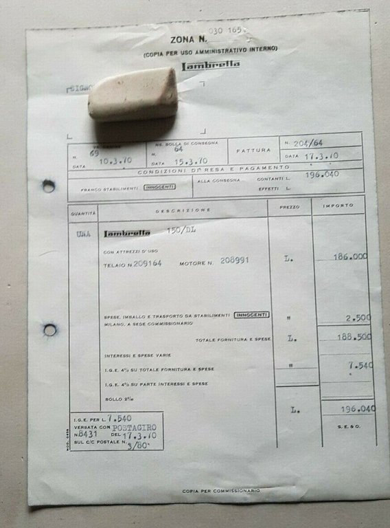 Innocenti Lambretta 150 DL Scooter 1970 fattura acquisto originale no depliant