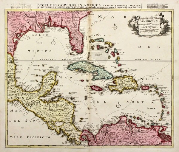 Copper engraving, mm 500x590, original colour. Very good condition with minor foxing at upper centerfold<BR>A rare re-issue of the plate by Danckerts showing prominently in the center Cuba, Haiti, the Bahamas and Florida, which is here marked in the map as the province 'Tegesta'. In Florida, or Florida Hispanica as it is labeled here, the peninsula is called Tegesta Prov. The province of Tegesta is a Dutch convention pioneered by Hessel Gerritz, hydrographer to the Dutch East India Company and the Dutch West India Company, and Johannes de Laet. It refers to the Tegesta people, an indigenous group active near what is today Miami-Dade. The Tegesta were one of the first groups to meet Europeans, specifically the conquistadores Ponce de Leòn and Pedro Menéndez de Avilés.<BR>It was originally made to illustrate the theater of the Nine Years' War (1688-1697), one of the many inter-imperial conflicts of this period. The map was again relevant as a theater of war because the European power were again at each others' throats over the power of the Hapsburg Monarchy. The war had actually started in 1739 in the Caribbean as the War of Jenkins Ear, when hostilities over illicit trade between the British and the Spanish led to Britain declaring war in 1739. Vice-Admiral Edward Vernon sacked Portobello at the end of that year. The war was later subsumed into the larger War of Austrian Succession, which had significant battles in the Caribbean. Route of the Spanish gold and silver fleets shown.<BR>Included is the Bahamas Channel route to Havana, the route from Veracruz to Havana, Havana to Cartagena, and Cartagena to Spain. The Spanish Empire operated a closed trading system, only allowing Spanish vessels to dock at and trade with ports in their colonies. The arrival of the galleon annually or semi-annually was a major event in the port cities, triggering fairs and festivities. <BR>In the right upper corner is a beautiful uncoloured title cartouche held by two putties. The map has a second title in Dutch along the upper part "Stoel des Oorlogs in America waar in vertoont werden alle desself voornaamste Eylande nieuwelycks uytgegeven door Reinier & Josua Ottens." with a mileage scale and table of explanations on either side.<BR>Joachim Ottens (1663 - 1719) and his sons Renier and Joshua were prominent Dutch booksellers and map publishers from about 1680 to 1790. Joachim, the founder of the firm, was initially employed as a copperplate engraver by Frederick de Wit. In 1711 Joachim founded his own firm. Though Joachim died only a few years later, his sons Renier and Joshua took over the firm and presided over its most prolific period <BR><BR>