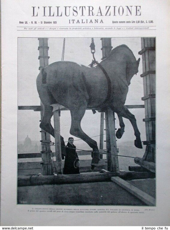 L'Illustrazione Italiana Rivista originale del 13 Dicembre 1925 Anno 52 - N. 50 Rarità per appassionati e collezionisti Segue sotto solamente un saggio del ricco contenuto presente Illustrato in copertina (segue foto): Il collocamento della grande quadriga dello scultore Ettore Ximenes sul palazzo di giustizia di Roma Illustrazione presente nelle pagine interne (segue foto): L'Italia pittoresca: Palermo Altra Illustrazione presente nelle pagine interne (segue foto): Le grotte di Carlsbad scoperte negli Stati Uniti d'America Tra gli argomenti trattati e le notizie contenute: Le onoranze di Milano a De Pinedo La firma del trattato di Locarno a Londra Fervore archeologico in Sicilia: Girgenti e Selinunte L'architettura della nuova romanità: un palazzo in via Vittorio Veneto Un poderoso organismo industriale per il commercio estero .e tanto altro ancora! NB: STRAPPO AL CENTRO A PAG 489/490 Qualora vogliate maggiori delucidazioni contattateci. In questo negozio troverai un'intera categoria dedicata alla collezione dell'Illustrazione Italiana , ne inseriamo diverse giornalmente. Sotto il link diretto a tutta la collezione: Riviste disponibili Cliccaci sopra, troverai di certo ciò che cerchi! L'illustrazione Italiana è stata una rivista settimanale italiana con sede a Milano, pubblicata ininterrottamente dal 1873 al 1962 per un totale di quasi 5 000 numeri. Fondata a Milano con la testata «Nuova illustrazione universale», fu edita dalla casa editrice Fratelli Treves, fondata da Emilio Treves, il quale fu anche il primo direttore della rivista. L'illustrazione italiana comincia ad avere un'ampia diffusione negli ambienti della medio-alta borghesia, grazie alla qualità degli articoli e soprattutto delle illustrazioni, spesso affidate ad artisti di primo piano come Achille Beltrame, Pietro Scoppetta, Luigi Bompard, Giuseppe Cosenza ed Ettore Ximenes (il quale svolgeva anche le funzioni di vicedirettore), tale qualità fu mantenuta poi nel tempo anche in seguito all'avvento della fotografia, tecnica che vide rappresentati sulle pagine dell'«Illustrazione» alcuni tra i migliori fotogiornalisti nazionali: Armando Bruni, Mario Crimella, Giulio Parisio ed Emilio Sommariva. Per i testi il periodico si avvalse della collaborazione, in qualità di articolisti, di alcuni dei nomi più importanti della letteratura italiana, fra cui ricordiamo Giosuè Carducci, Grazia Deledda e Luigi Pirandello (premi Nobel per la letteratura), lo scrittore verista Giovanni Verga, il poeta Gabriele D'Annunzio, il critico letterario e favolista Luigi Capuana ed Edmondo De Amicis, autore del celeberrimo romanzo "Cuore", capolavoro della letteratura per ragazzi. La grande fortuna dell'Illustrazione Italiana durò fino alla morte di Emilio Treves (1916), dopo la quale, pur avendo ancora tra i propri collaboratori scrittori del calibro di Eugenio Montale, Elio Vittorini, Salvatore Quasimodo, Riccardo Bacchelli, Italo Pietra, Niccolò Giani e Sergio Solmi, la rivista cominciò a mostrare i segni di un lento declino. La promulgazione delle leggi razziali fasciste accelerò il processo in atto: nel 1939 la Treves dovette cedere l'azienda alla Garzanti. Verso la metà del 1942, in seguito agli eventi della seconda guerra mondiale, L'illustrazione rallentò le sue uscite, fino ad essere trasformata in mensile nel 1951 da Livio Garzanti. Gli anni cinquanta videro la crescita vertiginosa dei rotocalchi, settimanali popolari di attualità. «L'Illustrazione Italiana» vide ridursi progressivamente il suo spazio, finché Garzanti la chiuse nel 1962. L'editore Guanda riprese la testata alla fine del 1981 e la ripubblicò con periodicità bimestrale. Il tentativo non incontrò sufficiente fortuna e la rivista fu chiusa nel 1996. Paypal Carta di credito Bonifico bancario Spedizione con posta ordinaria o raccomandata scelta dall'Acquirente nel momento del pagamento